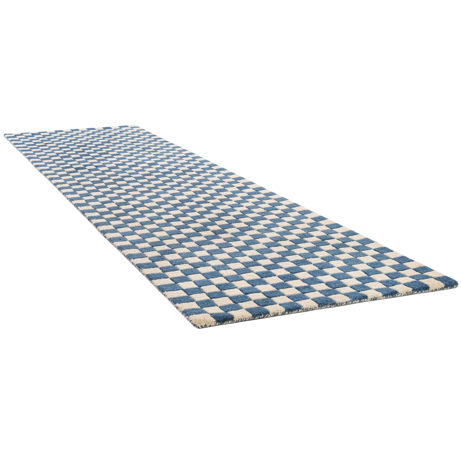 A 10 ft runner rug featuring a modern blue and white checkerboard pattern, perfect for hallways.