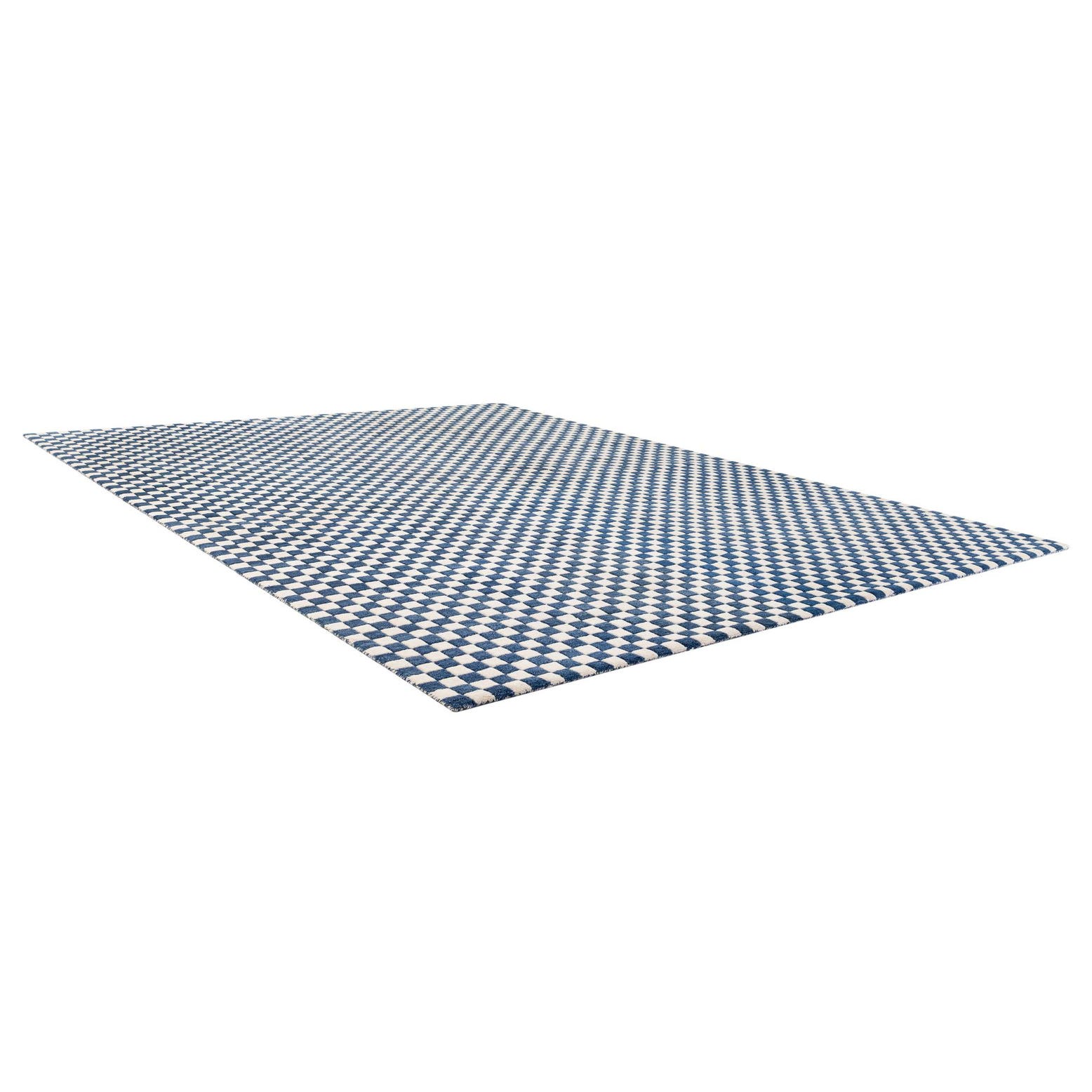 A compact checkerboard of small, evenly sized squares alternates deep blue with clean white across the surface, creating a bold yet orderly geometric field. Hand-tufted from 100% wool, the rug has a low, dense pile that feels soft underfoot while keeping the pattern’s sharp definition. Running your hand across it reveals a subtle wool nap that catches the light and adds gentle dimensionality to the two-tone design.