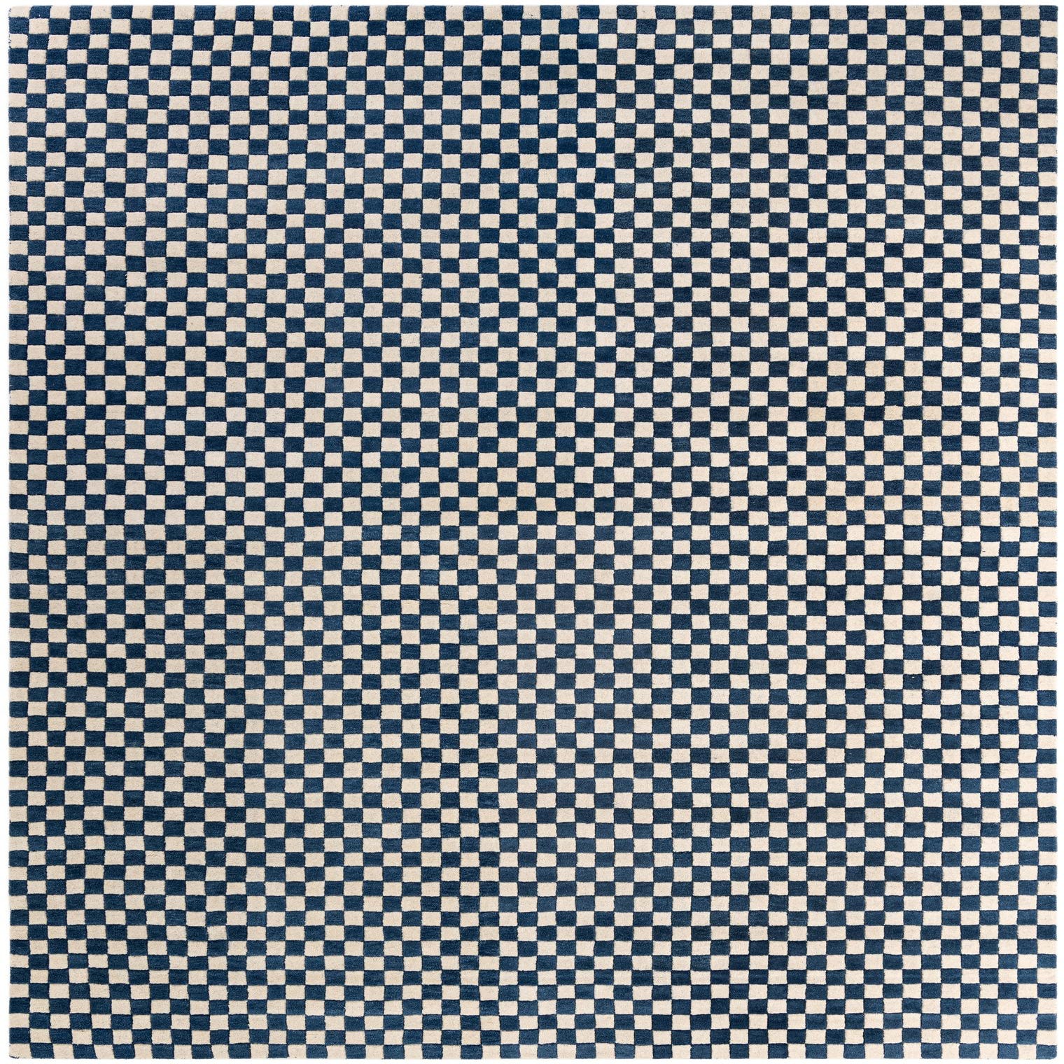 A compact checkerboard of small, evenly sized squares alternates deep blue with clean white across the surface, creating a bold yet orderly geometric field. Hand-tufted from 100% wool, the rug has a low, dense pile that feels soft underfoot while keeping the pattern’s sharp definition. Running your hand across it reveals a subtle wool nap that catches the light and adds gentle dimensionality to the two-tone design.