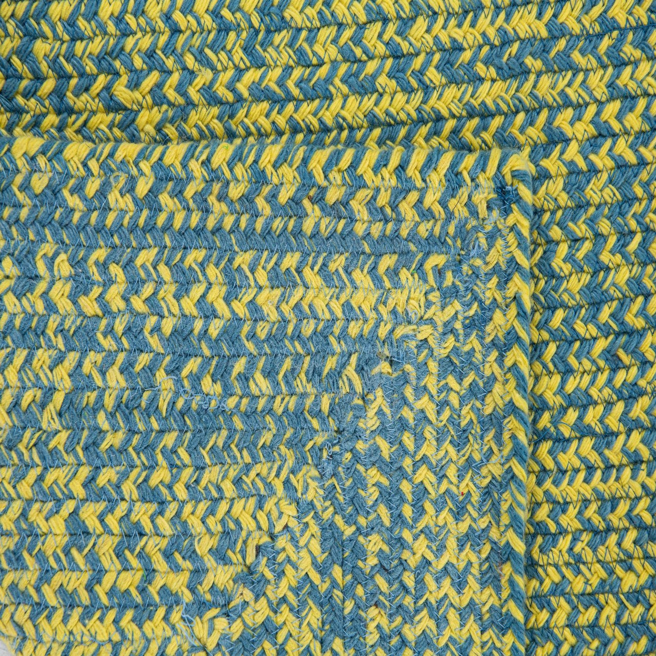 A 2x3 rectangular Chindi Cotton rug in a vibrant blue and yellow braided pattern, suitable for a kitchen or entryway.