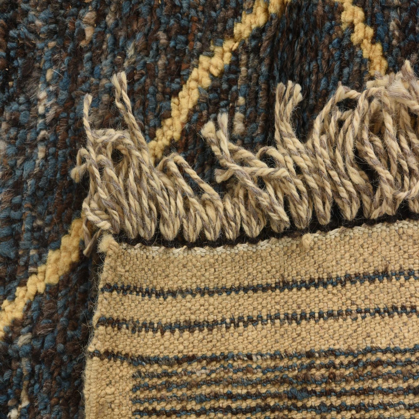 A 5x8 rectangular blue and brown tribal shag rug with a yellow diamond pattern and natural fringe.