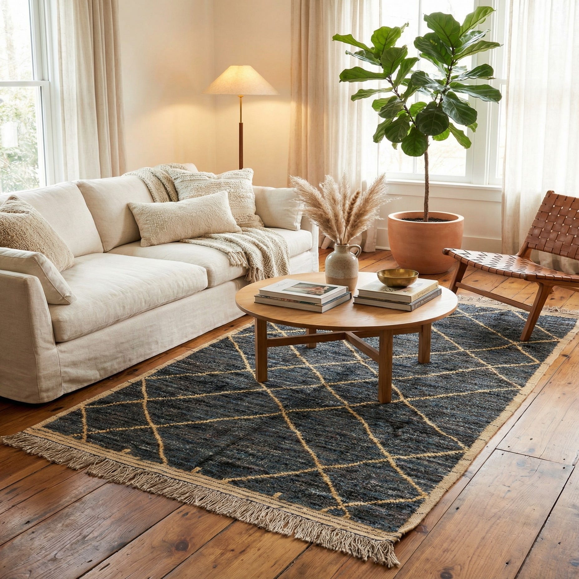 A 5x8 rectangular blue and brown shag rug with a yellow diamond tribal pattern and fringed ends.