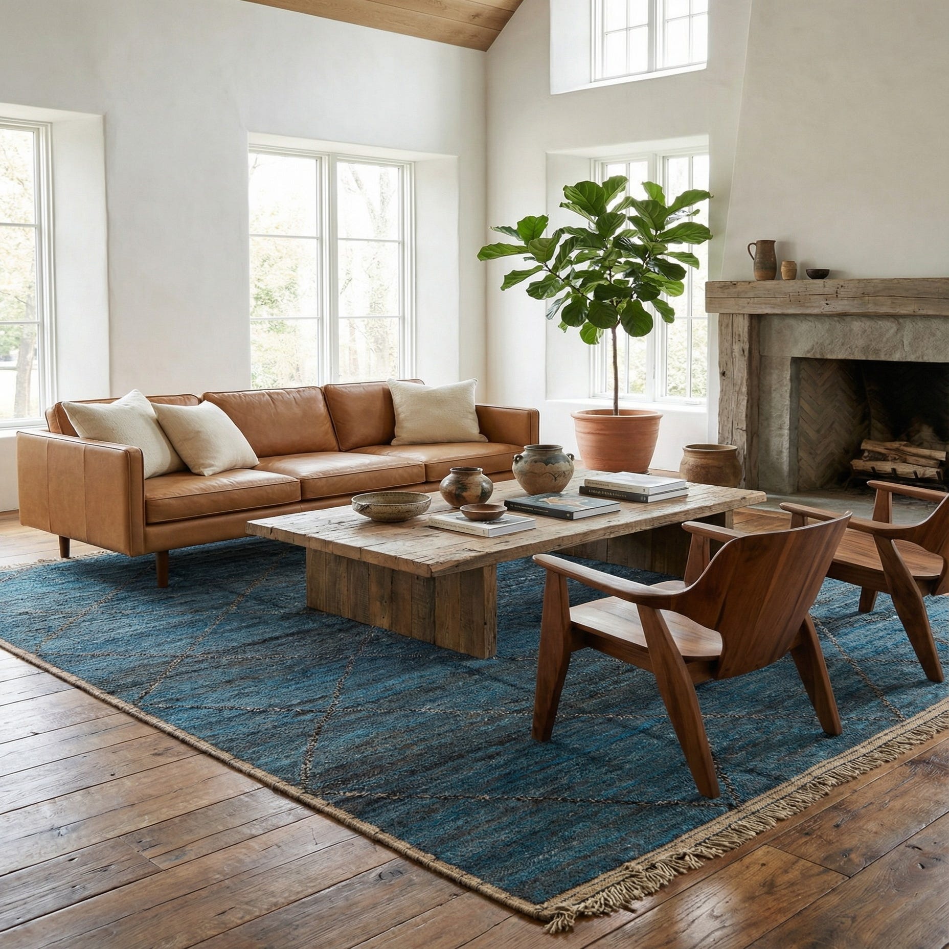 A 6x9 rectangular blue and brown Moroccan shag rug with a tribal diamond pattern, ideal for a living room.