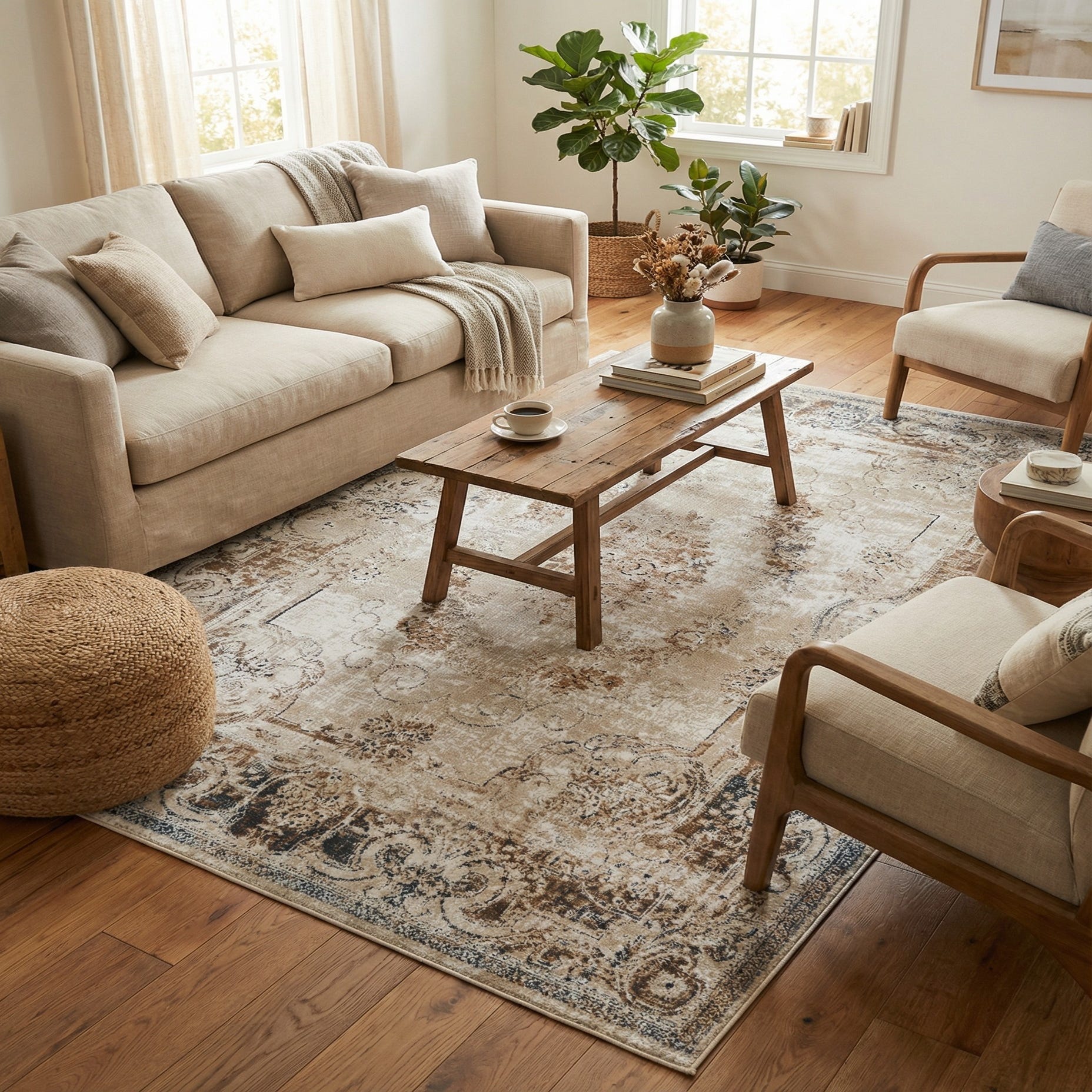 This rug suits transitional and casual-traditional interiors, where its muted palette pairs easily with linen upholstery, warm wood tones, or muted metal finishes. Use it to anchor a living room seating group, place it under a bedroom suite to add warmth and pattern, or introduce it to an entry or dining area where a soft, neutral foundation is desired. The overall look complements coastal-inspired, farmhouse, and modern-classic schemes that favor layered neutrals and understated ornament.