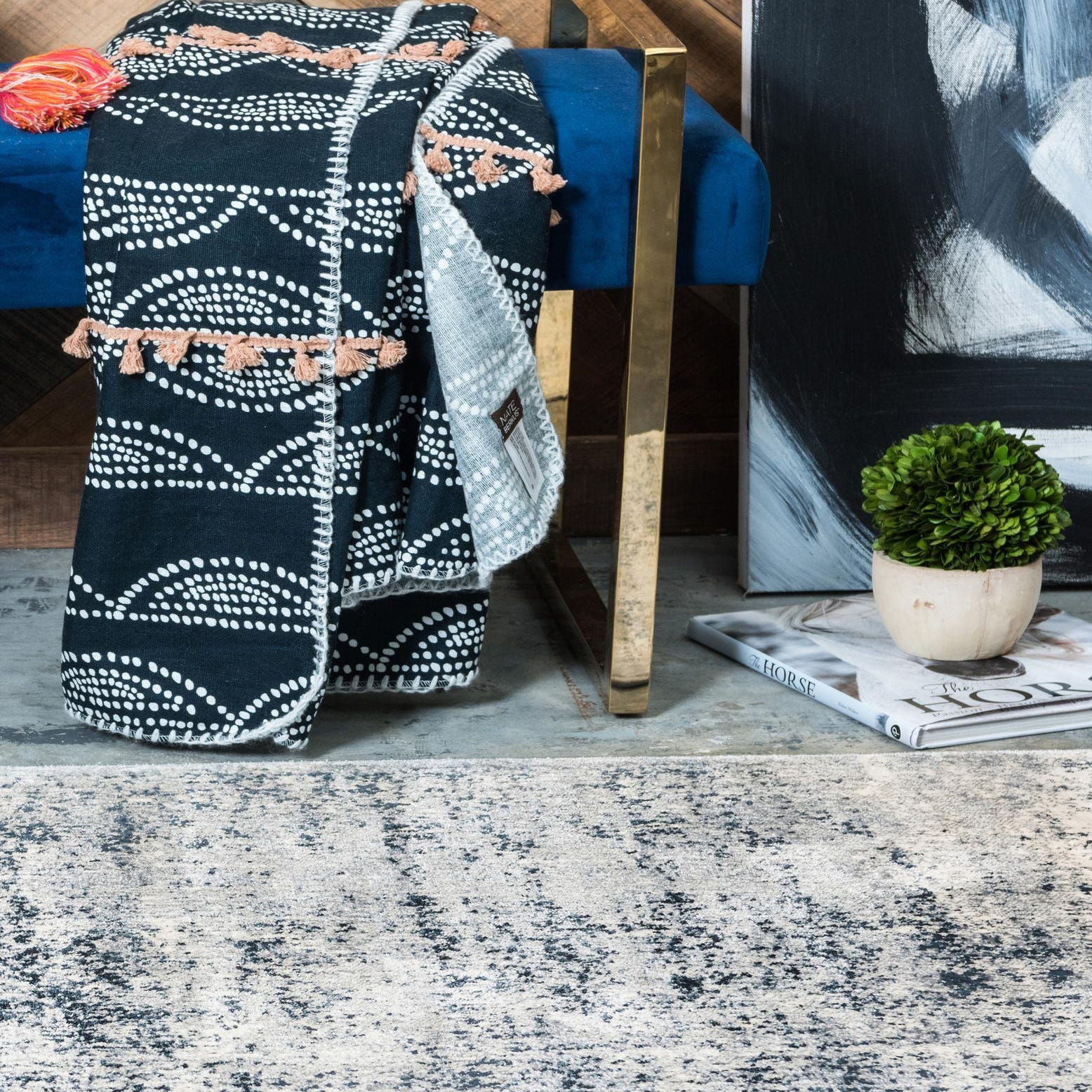 This runner is adept at concealing everyday wear and is inherently stain-resistant, ensuring easy maintenance and longevity. The shed-free nature of the rug further enhances its suitability for various living spaces. Given its color scheme and contemporary design, this rug would complement interiors with a modern minimalist aesthetic, industrial themes, or transitional decor. It serves not only as a stylish floor covering but also as a unifying element for spaces that balance neutral and bold design elements. Whether laid down in a hallway, entryway, or alongside a kitchen island, this runner provides both function and elegance.