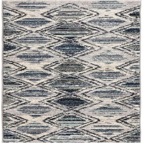 A 12 ft runner rug with a modern Southwestern trellis pattern in varying shades of blue, gray, and silver.