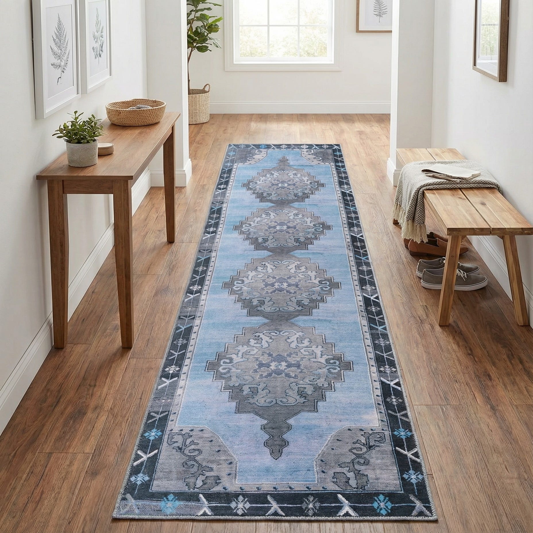 A 12 ft runner rug in blues and grays with a vintage Oriental medallion pattern, ideal for a hallway.