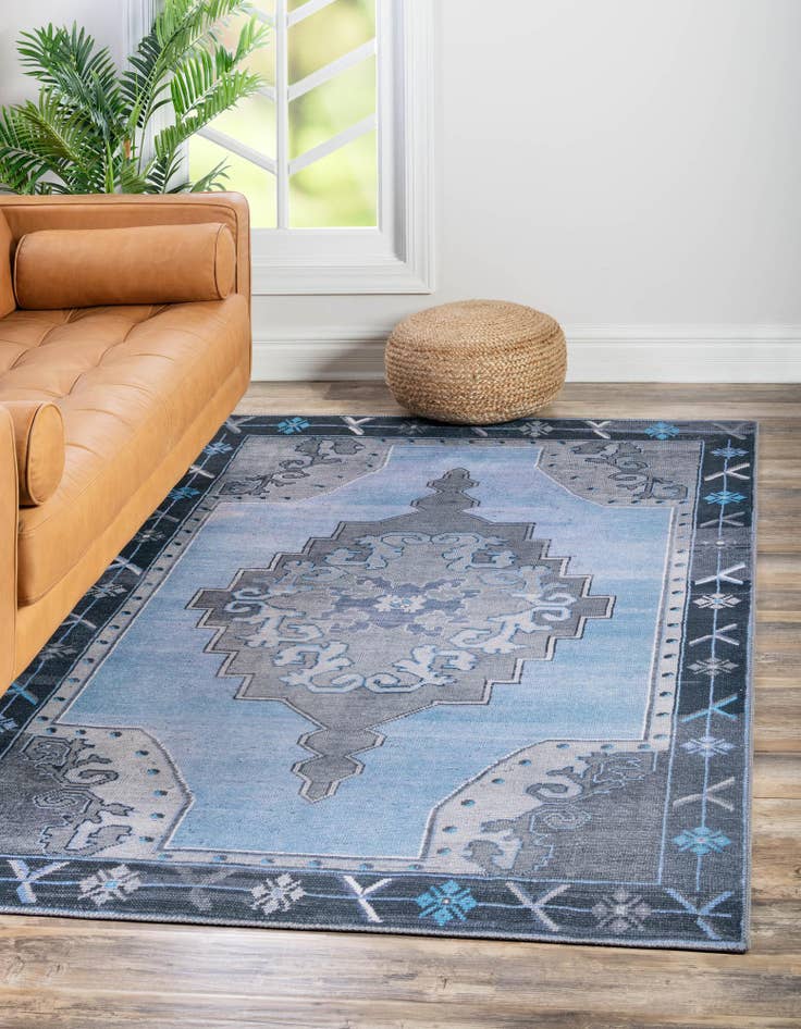 Machine-made of 100% polyester, the construction produces consistent color and pattern definition across the weave. Use it as an entryway accent, tucked at the foot of a bed, layered beneath a small coffee table, or placed in a reading nook to introduce a calm, blue-gray foundation. It pairs naturally with coastal, transitional, or modern farmhouse interiors, and works equally well in contemporary and Scandinavian schemes that favor muted tones and clean lines.