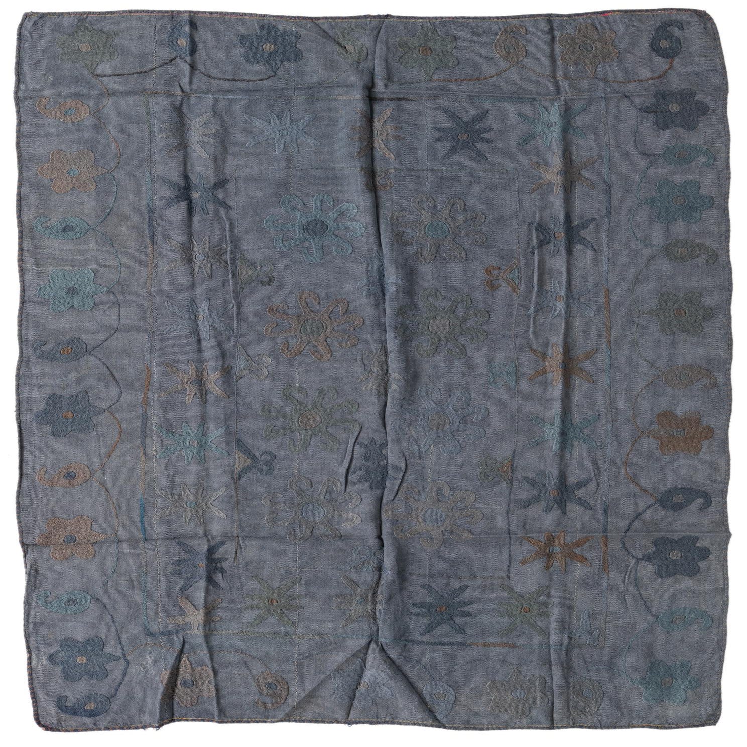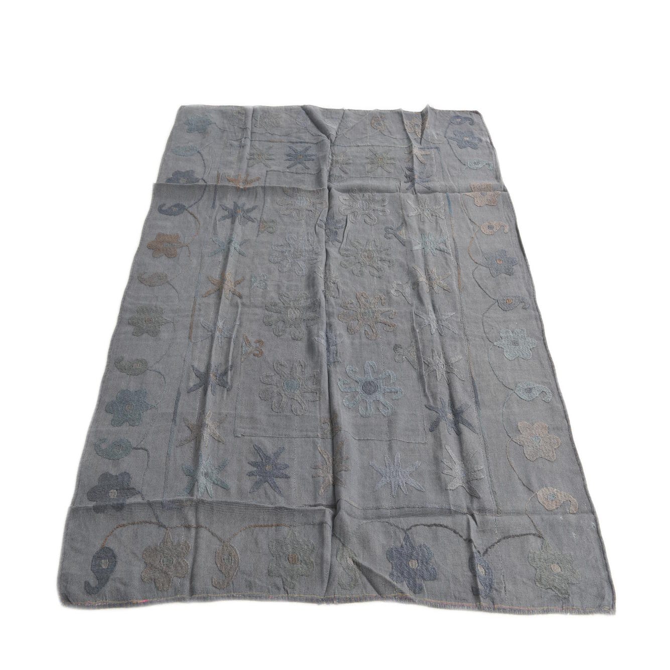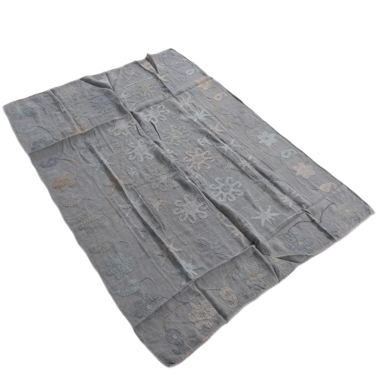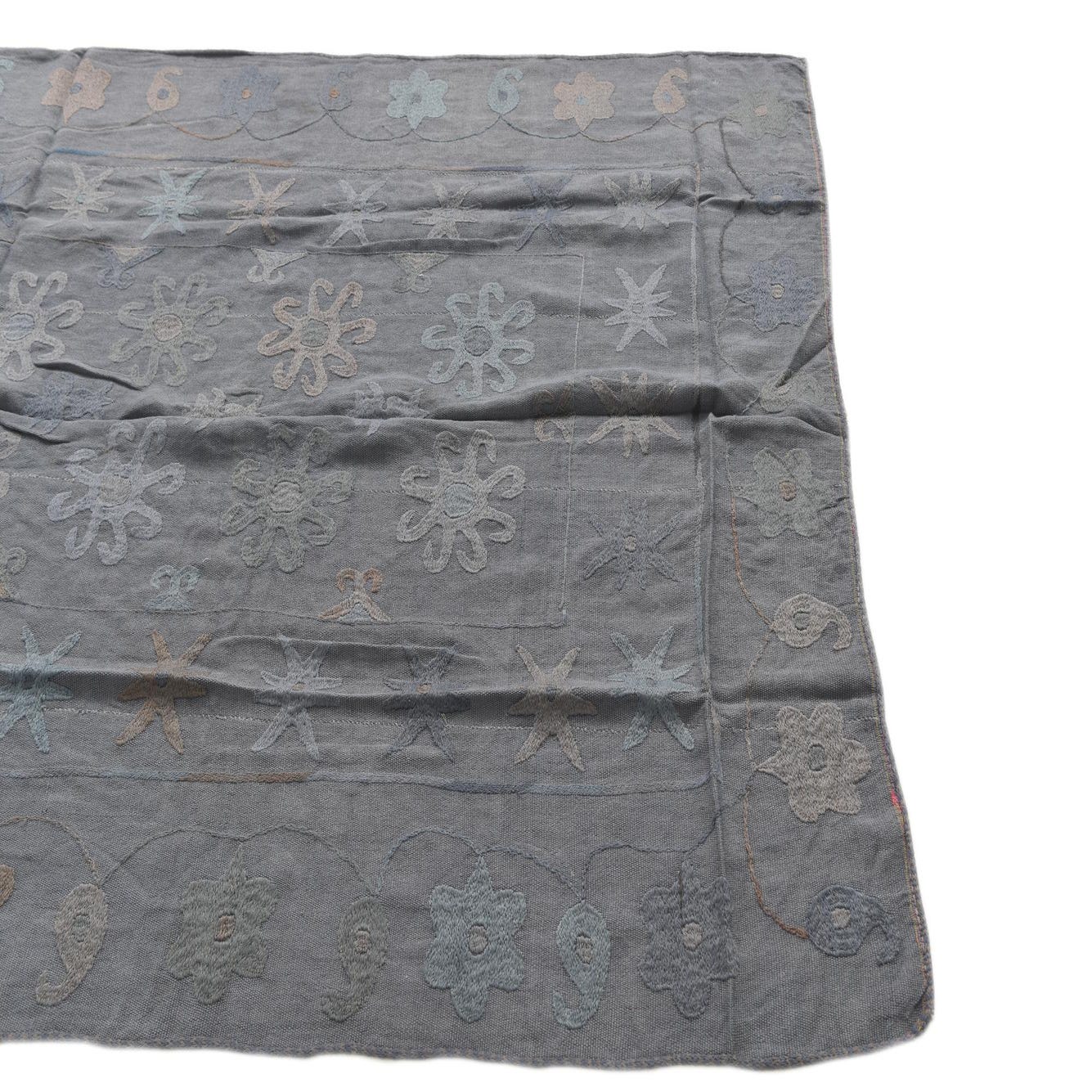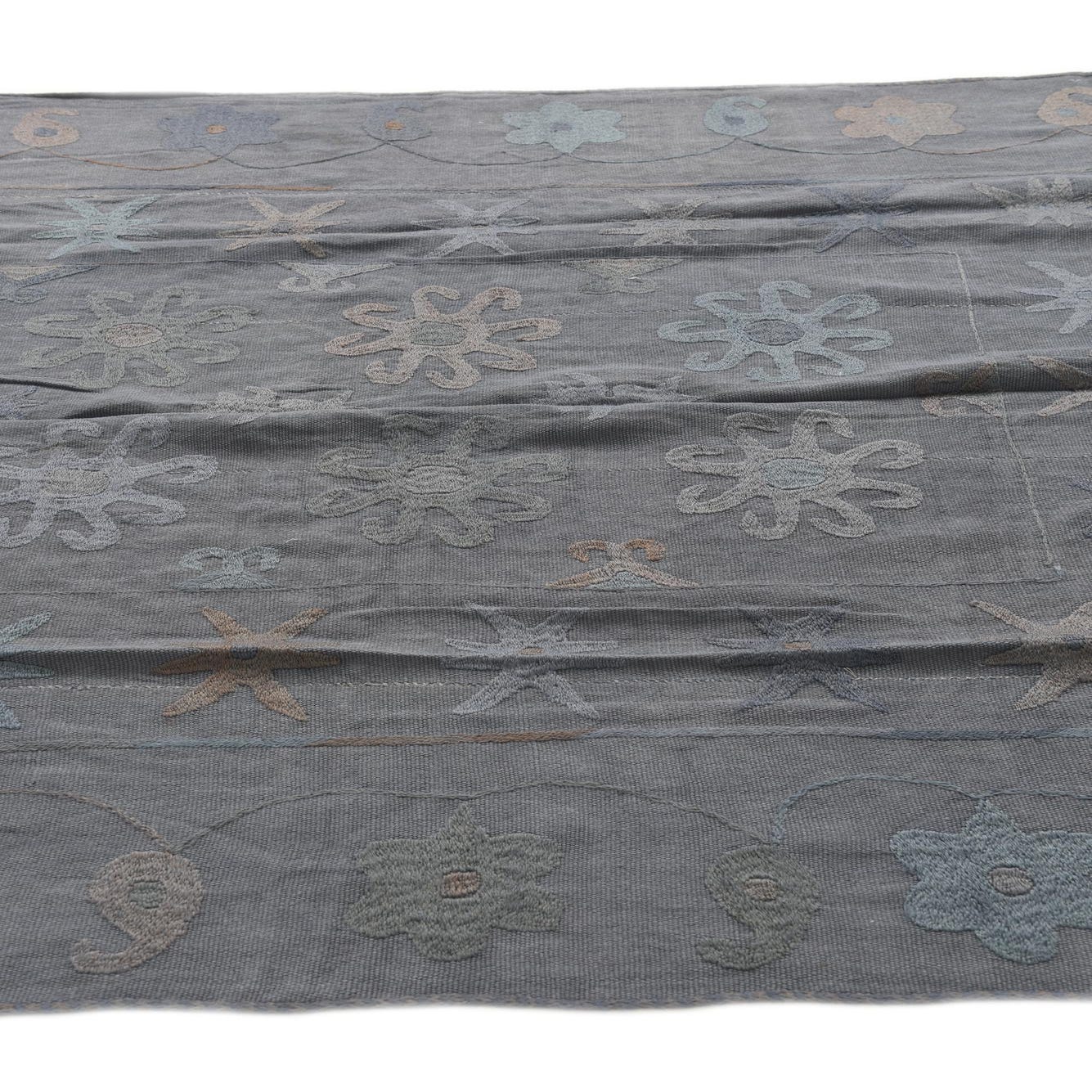 Ideal for modern, eclectic, or bohemian interiors, this Kilim Suzani rug can serve as a grounding element in a living room beneath a coffee table or as a defining piece in a home office. Its understated color scheme allows it to complement a variety of decor styles, from minimalist spaces that benefit from a touch of texture and pattern to more maximalist environments where it can harmoniously coexist with other decorative pieces.