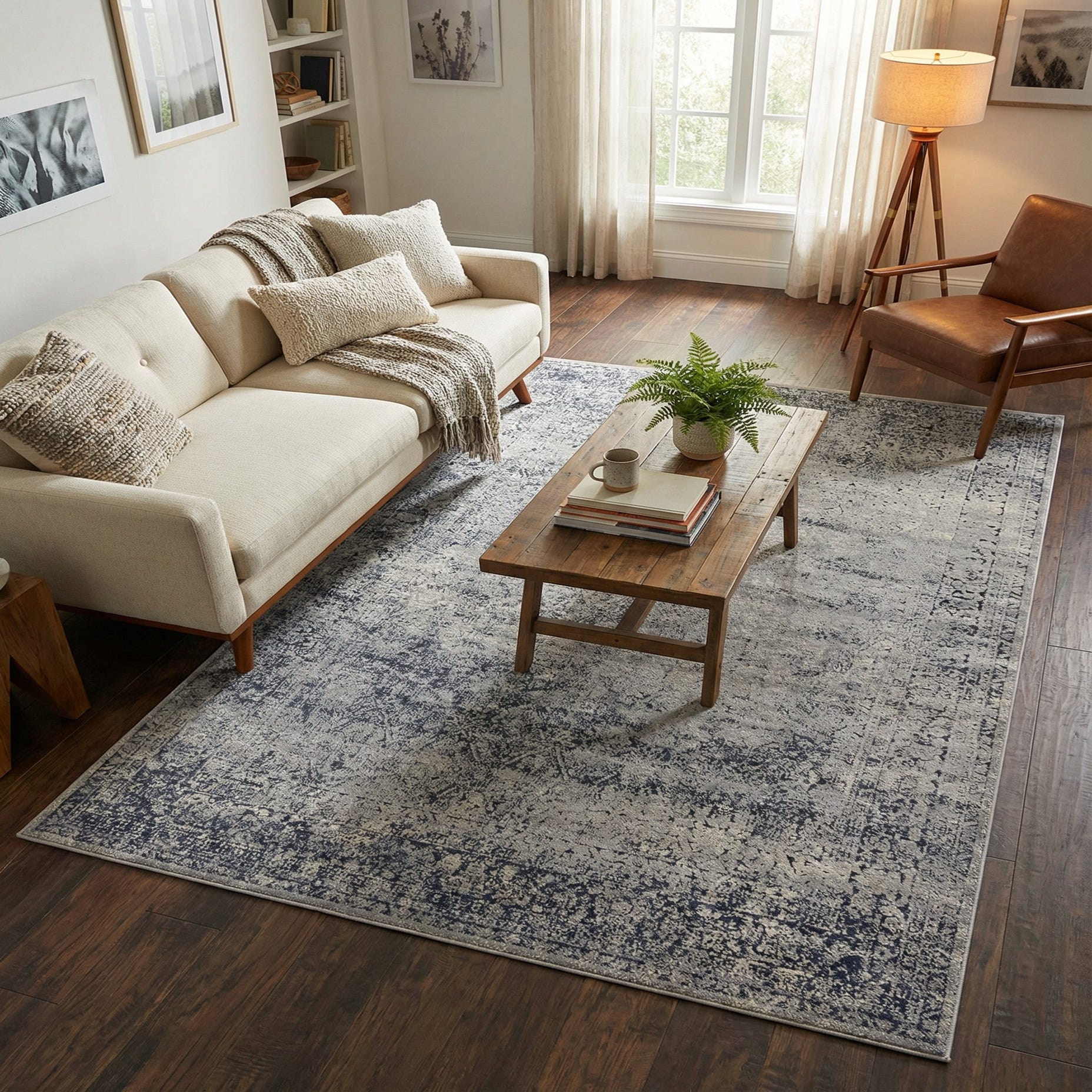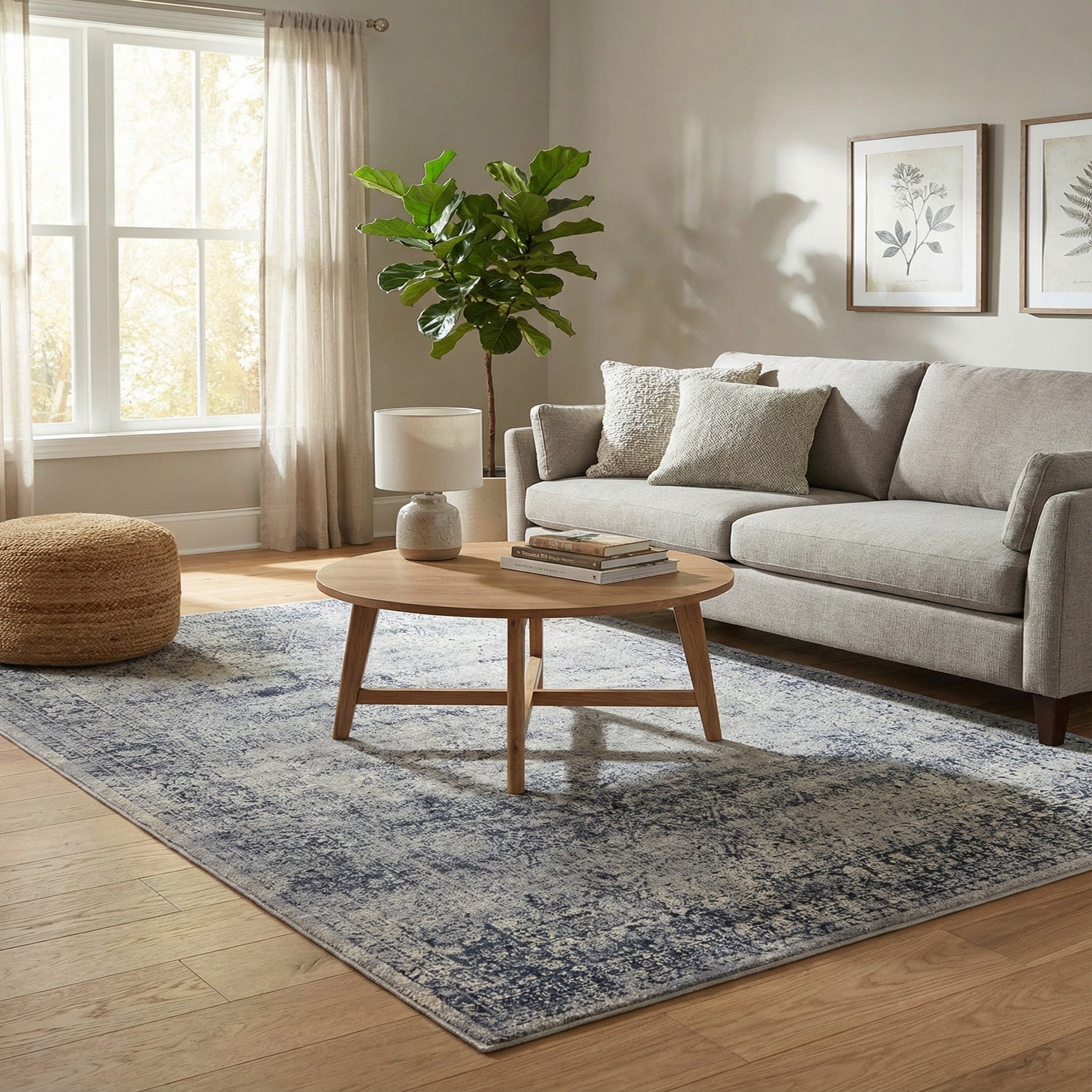 The chenille fibers offer a smooth, velvety touch underfoot while the polypropylene core provides structure and resilience, so the rug feels soft yet grounded. The calming blue gray background and neutral beige and gray tones make it well-suited to transitional, coastal, or modern farmhouse schemes. Place it beneath a sofa and coffee table to anchor a living room, layer it at the foot of a bed for added warmth, or use it to soften an office with light- to mid-tone wood furniture, navy or cream upholstery, and mixed metal accents.