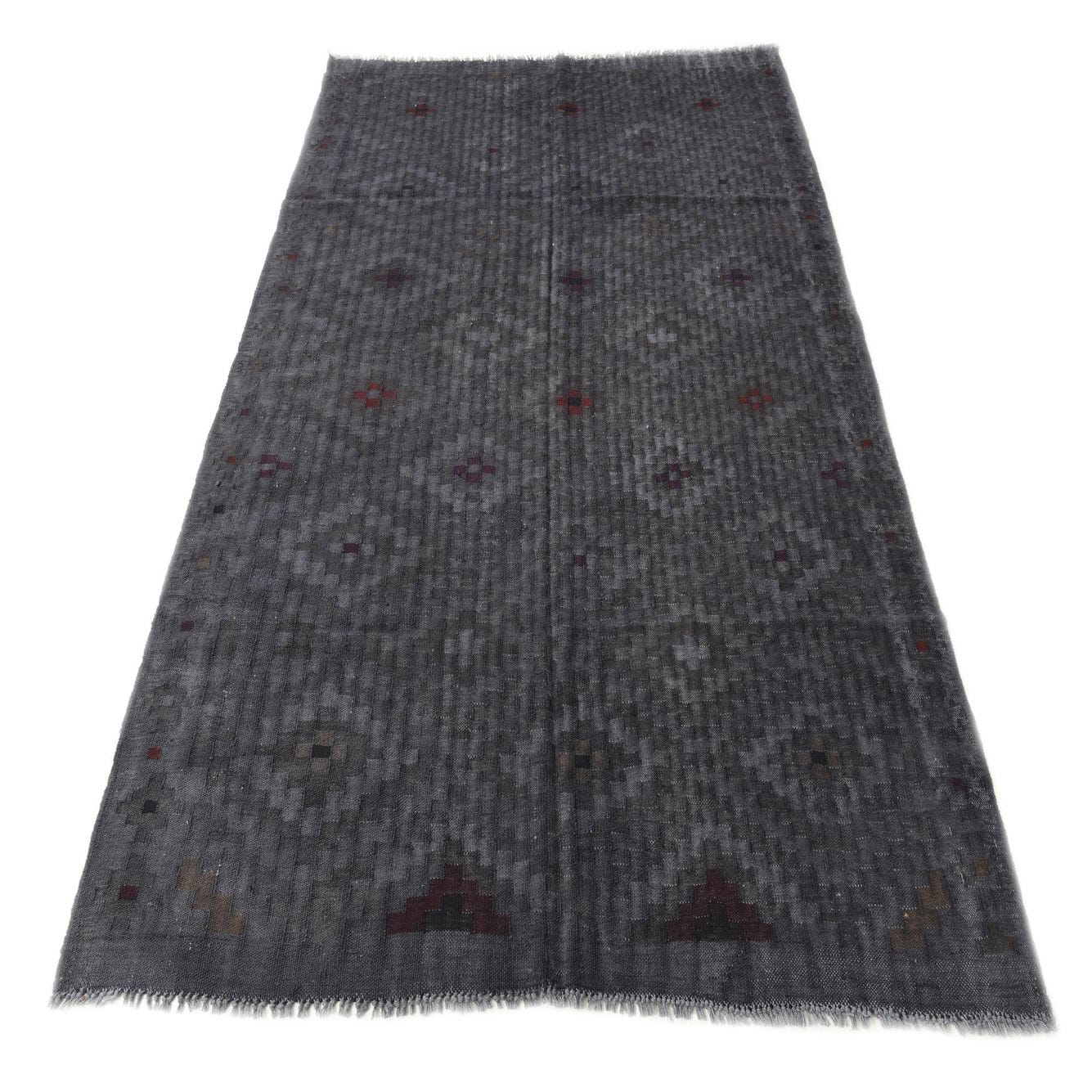 The rug exhibits a flatweave construction, a hallmark of the Kilim technique, offering a durable and textured surface. The presence of fringe on each end adds a classic decorative finish that enhances its artisanal appeal.