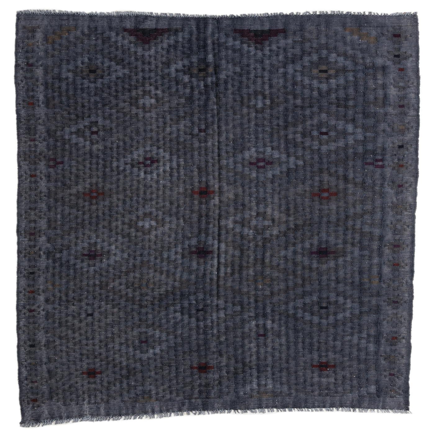 The Kilim Fars collection presents a hand-woven cotton rug in a 5x8 size that reflects traditional craftsmanship and design. This piece features a Blue Gray background color, thoughtfully complemented by intricate patterns in Brown and Burgundy accents. Its symmetrical patterning and subtle color palette lend a visual interest that harmonizes with diverse decorative styles.