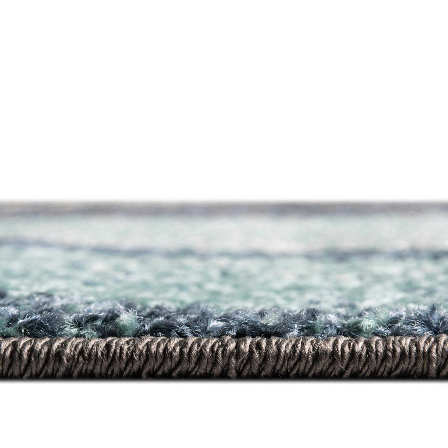 This runner would work exceptionally well in hallways, entryways, or alongside beds where its linear form can elongate the space. It could also be placed in a home office or study, adding a dynamic visual element without overwhelming the room's design. This rug's mix of cool and neutral tones allows it to fit seamlessly with a variety of color schemes and furniture styles, making it a versatile choice for any home.