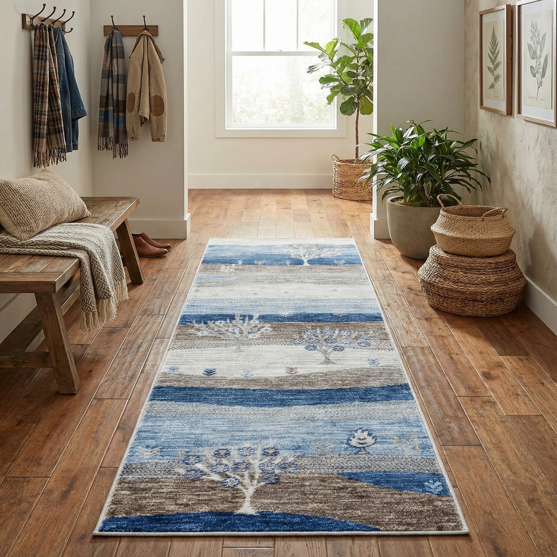 The stain-resistant, pet-friendly, and shed-free properties of this runner make it a practical choice for high-traffic areas. Its design is versatile enough to complement various interior styles, such as coastal-inspired decors with its cool, oceanic tones, or a contemporary setting where its clean lines and minimalist pattern can add a touch of sophistication without overwhelming the space. Ideal for hallways, entryways, or alongside a kitchen island, this runner serves both aesthetic and functional purposes within a home.