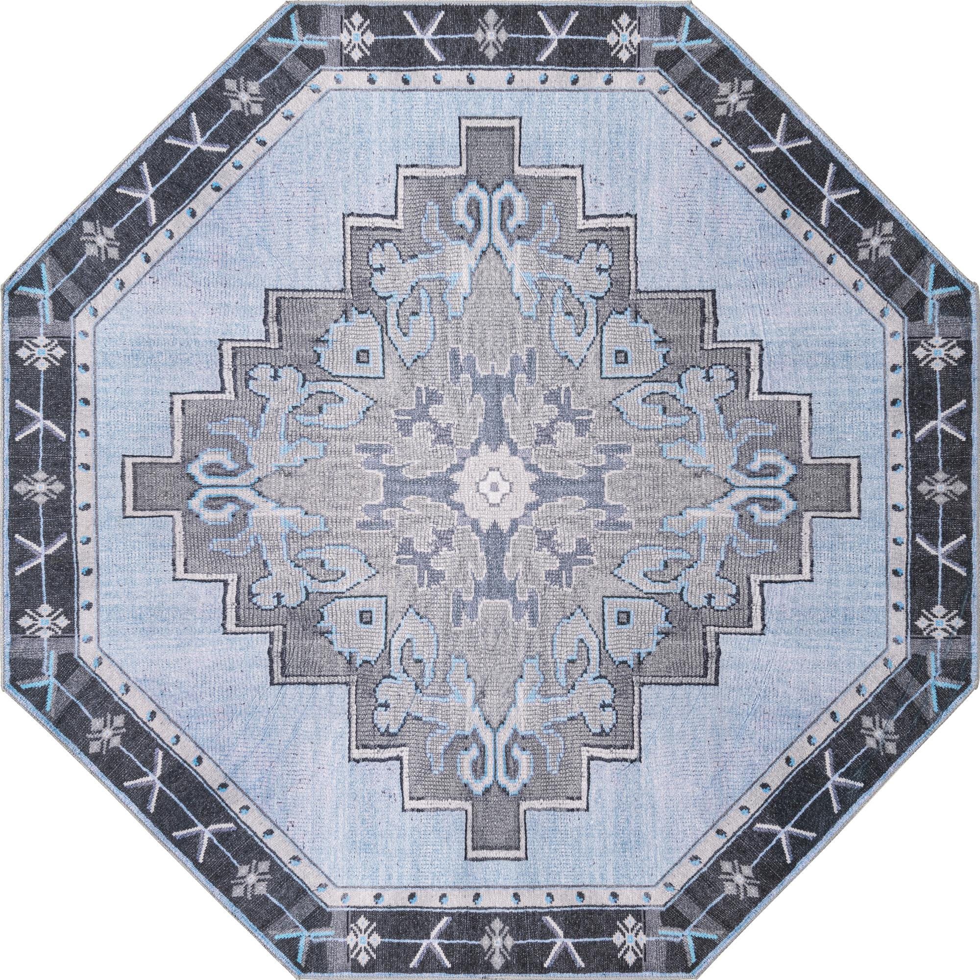 An octagon-shaped Rugs.com Timeless rug, 7' 6 x 7' 6, featuring a blue and gray vintage oriental medallion pattern with a dark border.