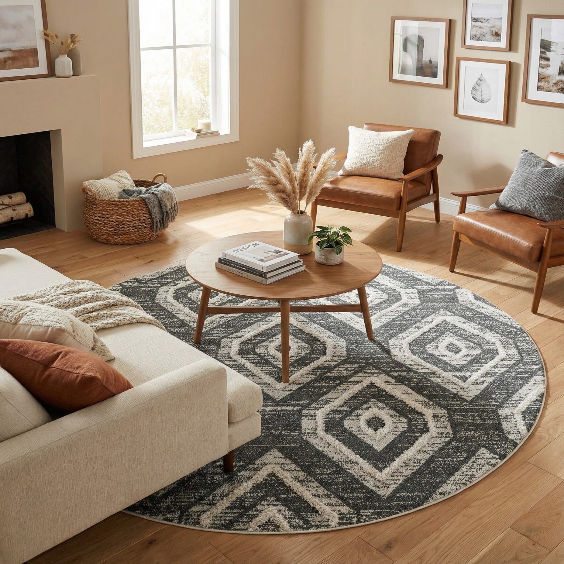 This round rug works well as the focal anchor in a seating area or beneath a round dining table, where the repeating diamonds add structure and movement to the layout. Pair it with light wood furniture and soft neutrals for a contemporary coastal or Scandinavian-inspired room, or use it to balance darker leather pieces and metal accents in an urban living space. Its durable, easy-care construction makes it suitable for high-traffic zones such as an entry or family room while keeping a refined, approachable look.
