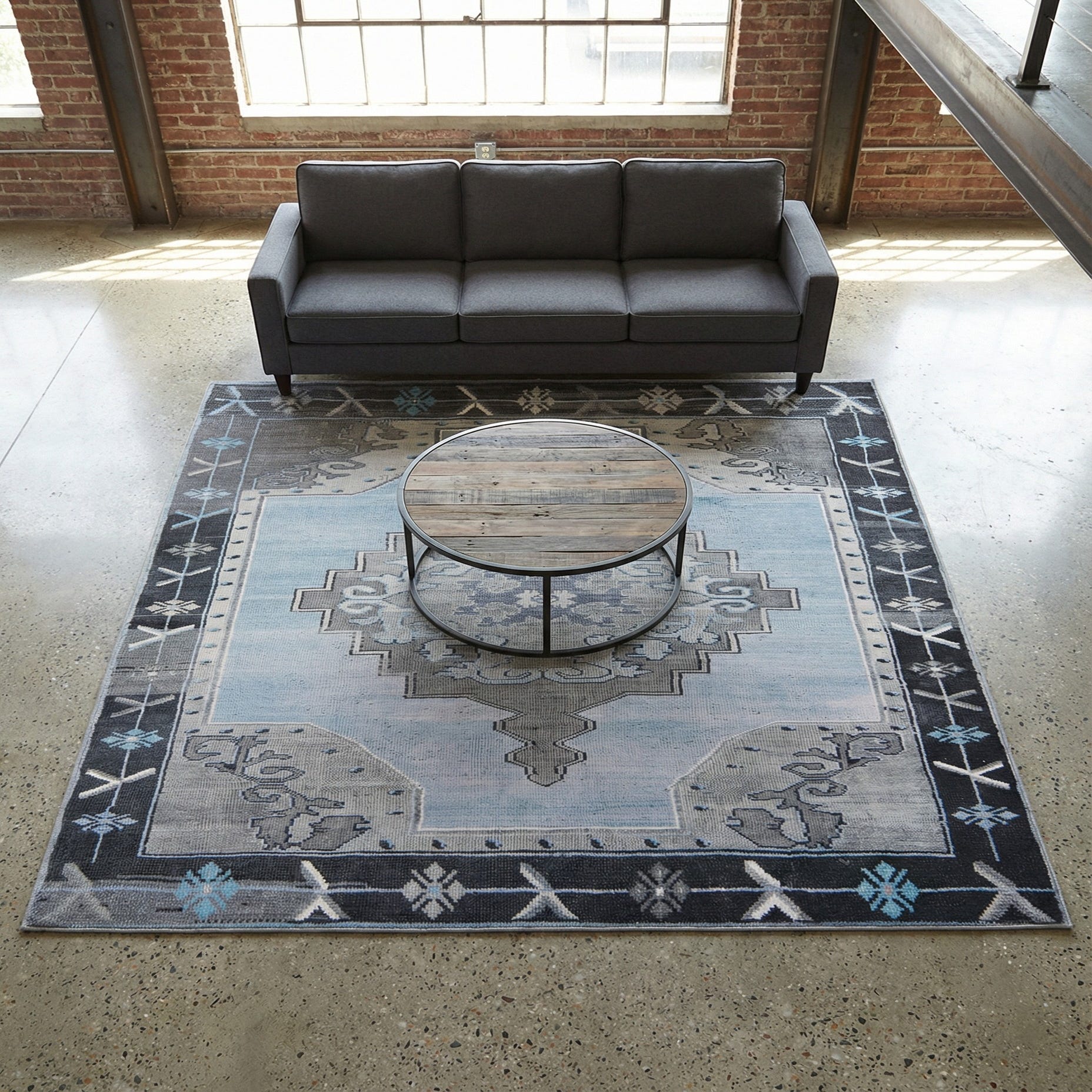 Primary color is Blue Gray. Colors in this rug include: Blue Gray, Ivory, Black.