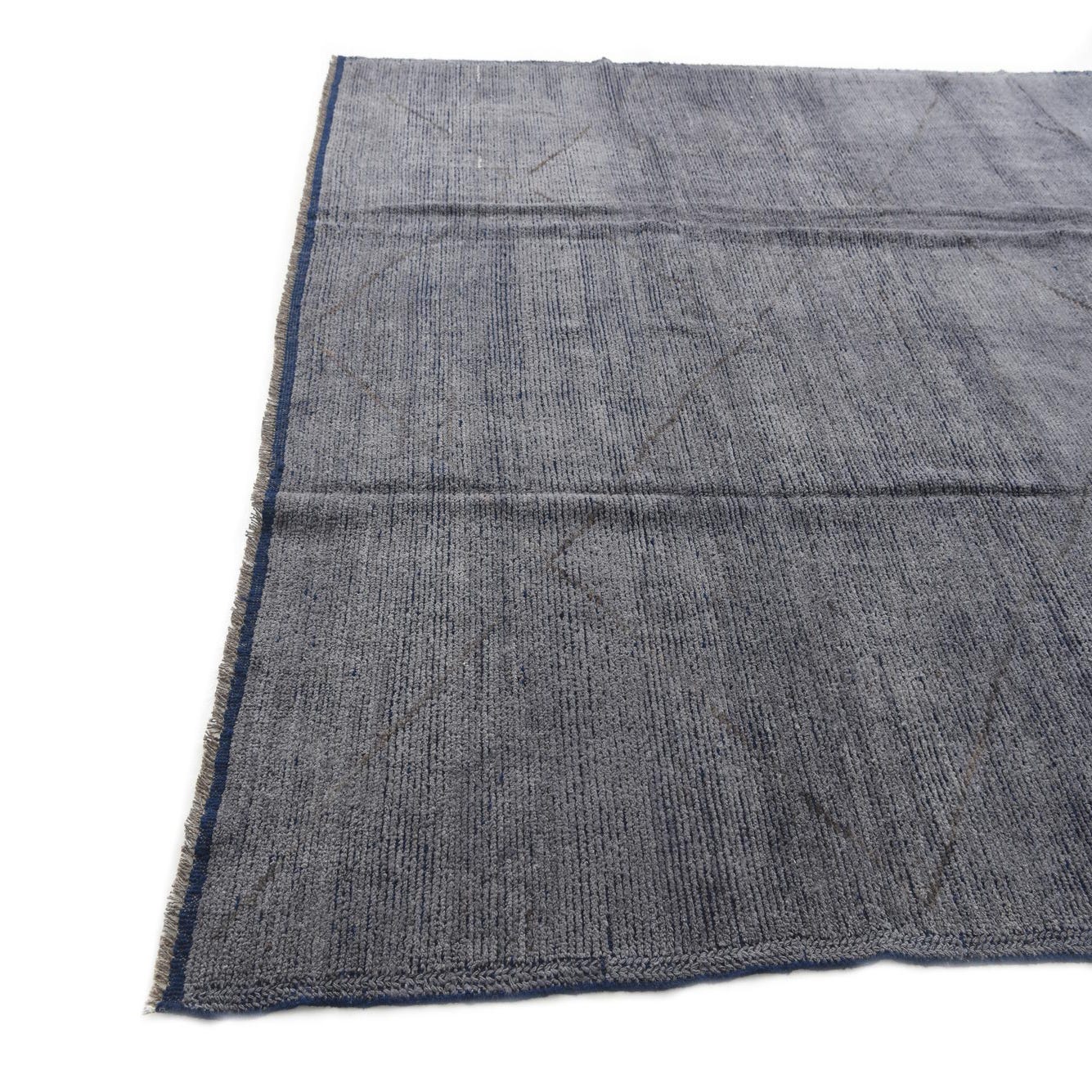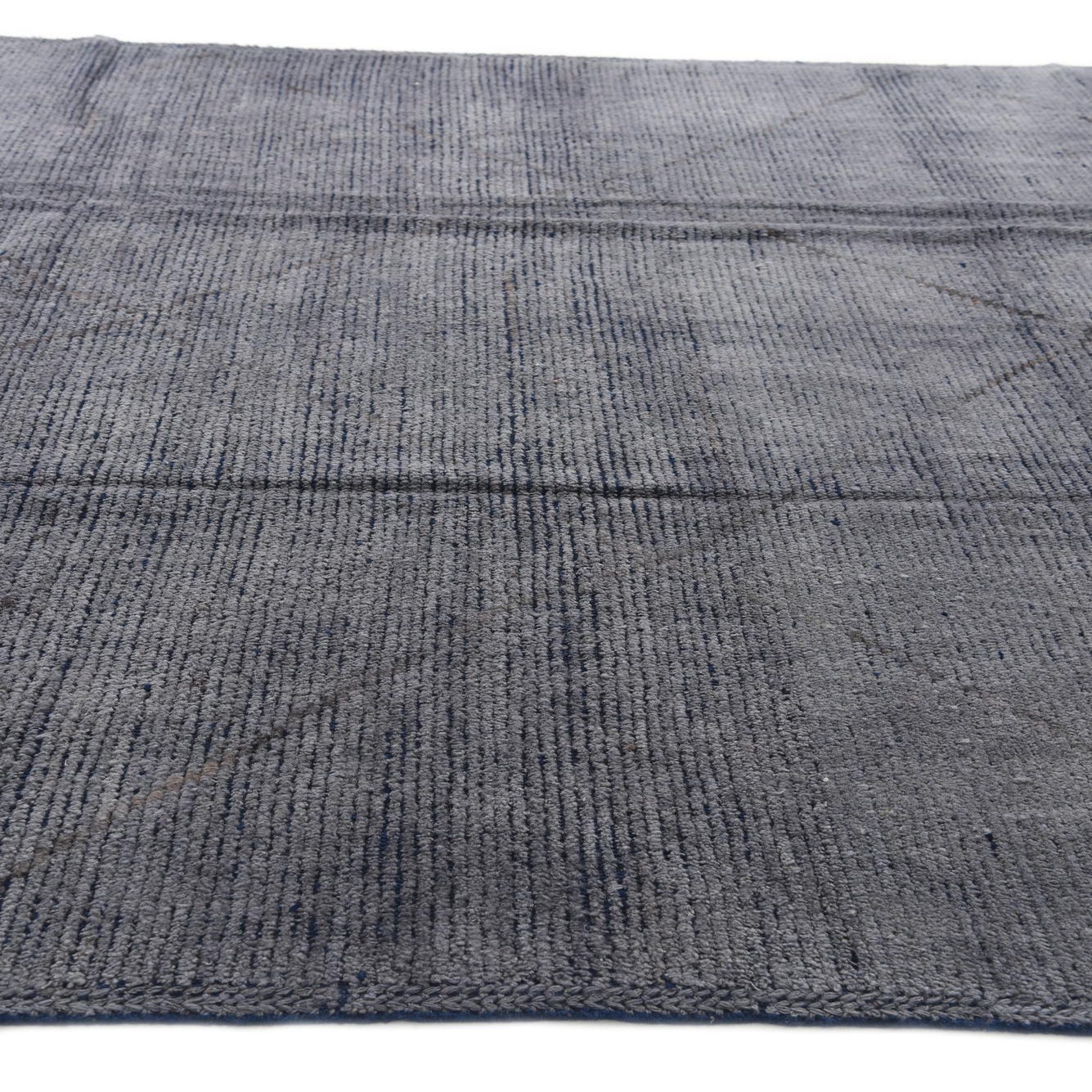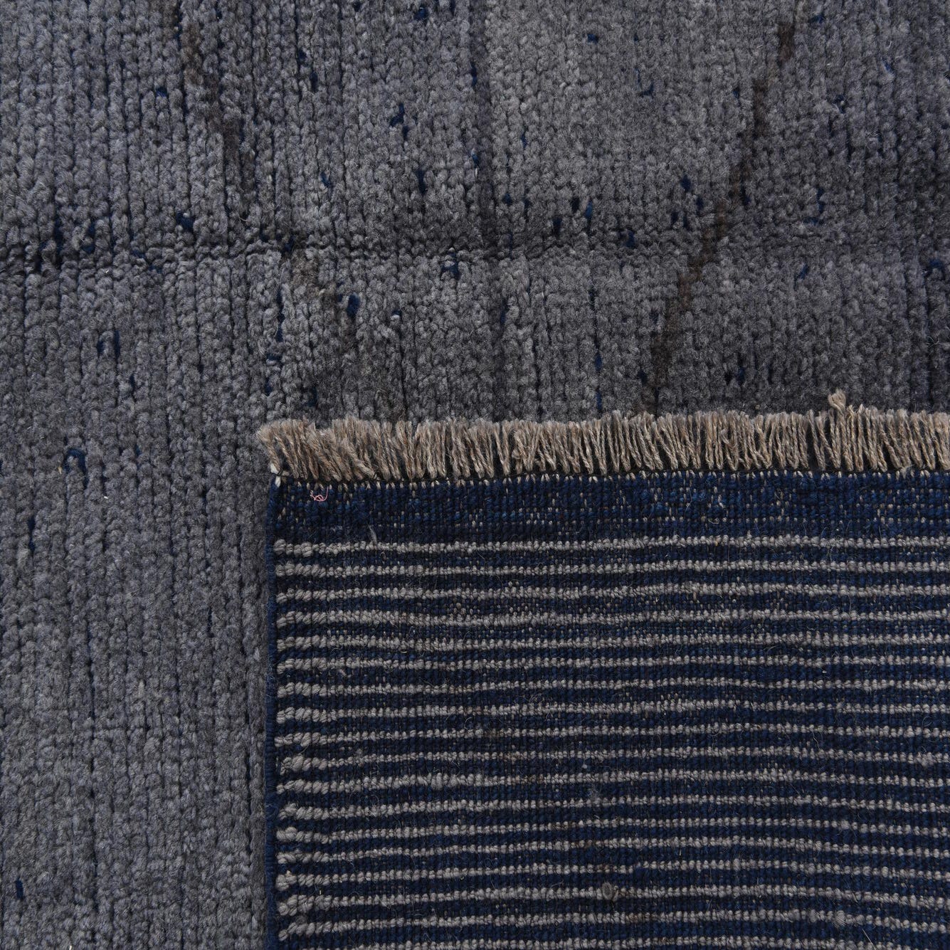 This Moroccan collection rug features an understated yet distinct pattern that draws from traditional Berber motifs, reinterpreted in a contemporary, geometric fashion. Hand-knotted of 100% wool, the rug provides a luxurious texture that promises durability and comfort underfoot. The palette is composed of a soothing blue-gray background accented by black outlines that form the subtle, abstract designs, giving it a versatile look that can integrate seamlessly into various decor settings.