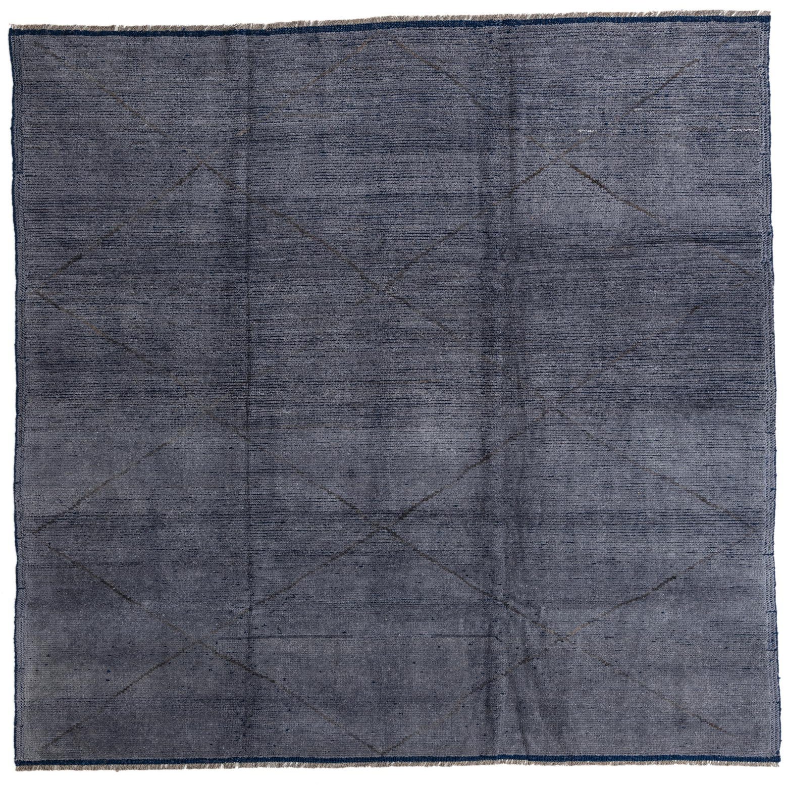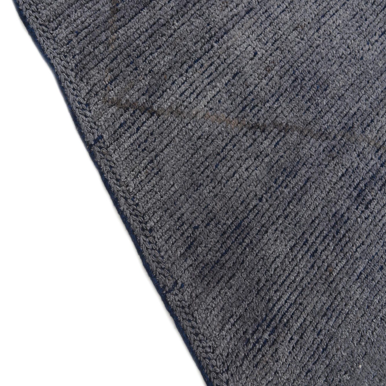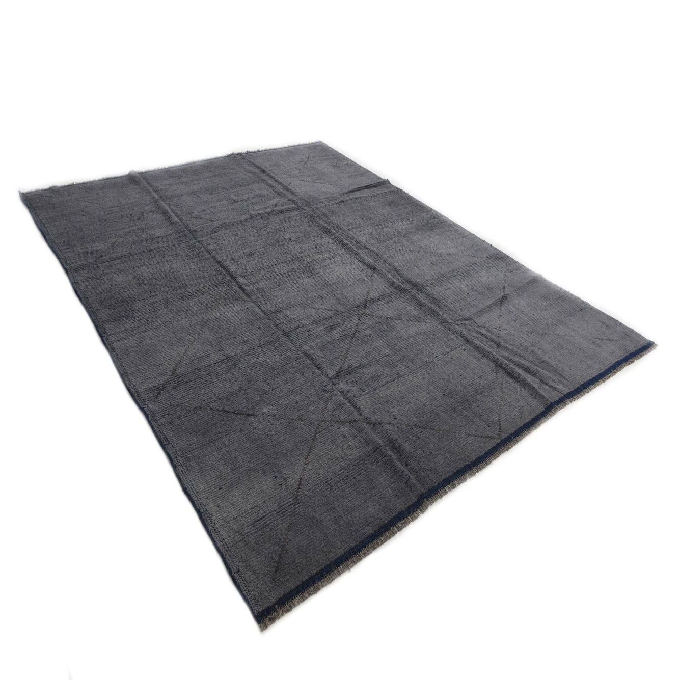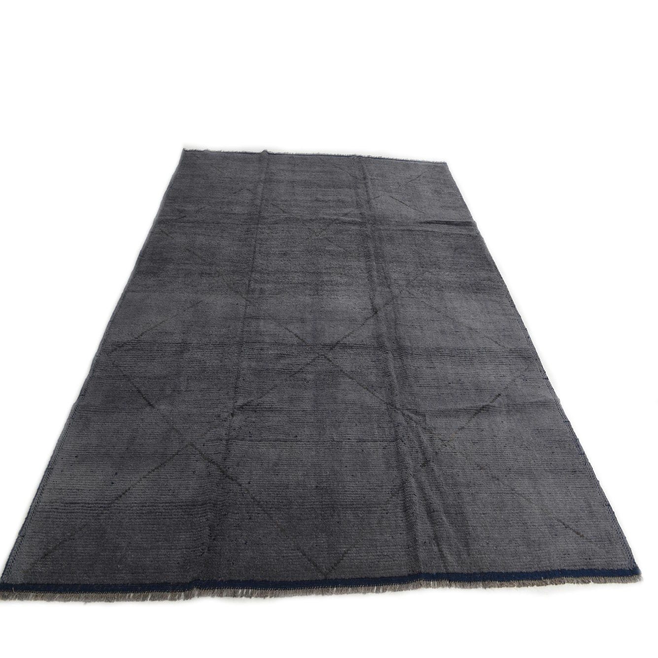 This Moroccan collection rug features an understated yet distinct pattern that draws from traditional Berber motifs, reinterpreted in a contemporary, geometric fashion. Hand-knotted of 100% wool, the rug provides a luxurious texture that promises durability and comfort underfoot. The palette is composed of a soothing blue-gray background accented by black outlines that form the subtle, abstract designs, giving it a versatile look that can integrate seamlessly into various decor settings.