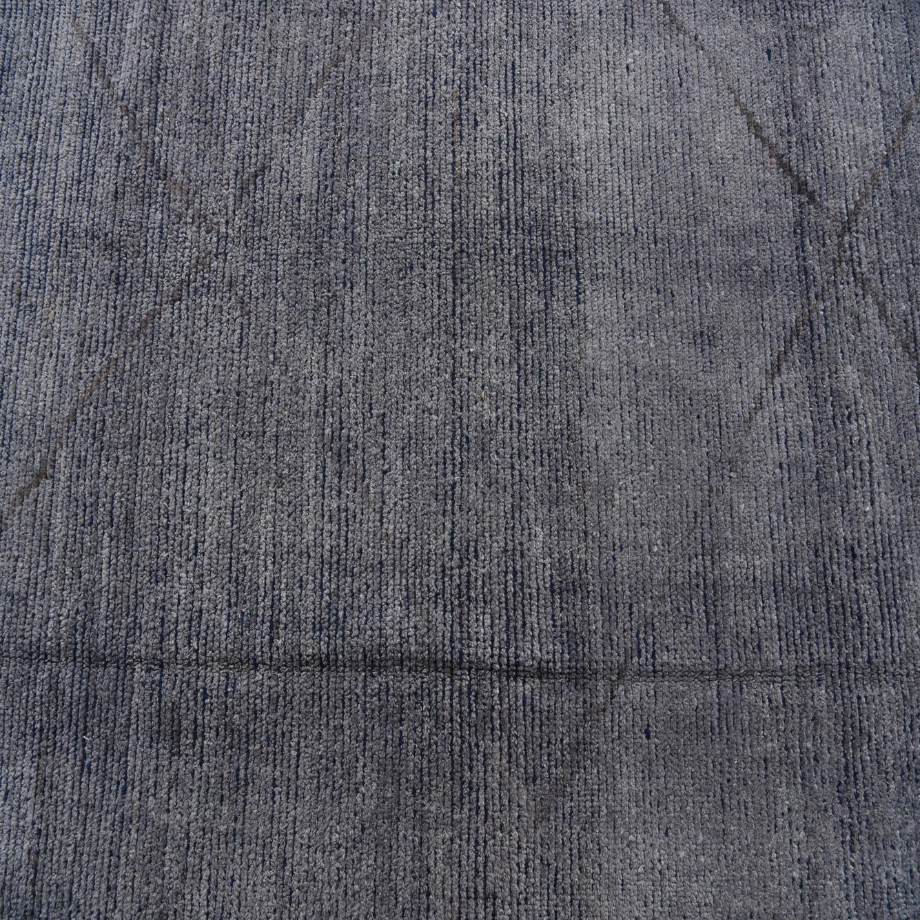 An 8x10 rectangular blue and gray wool shag rug with a subtle tribal geometric pattern, suitable for a living room.