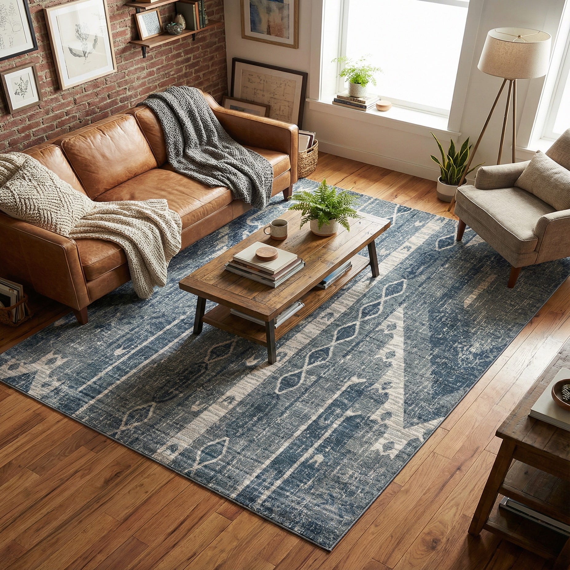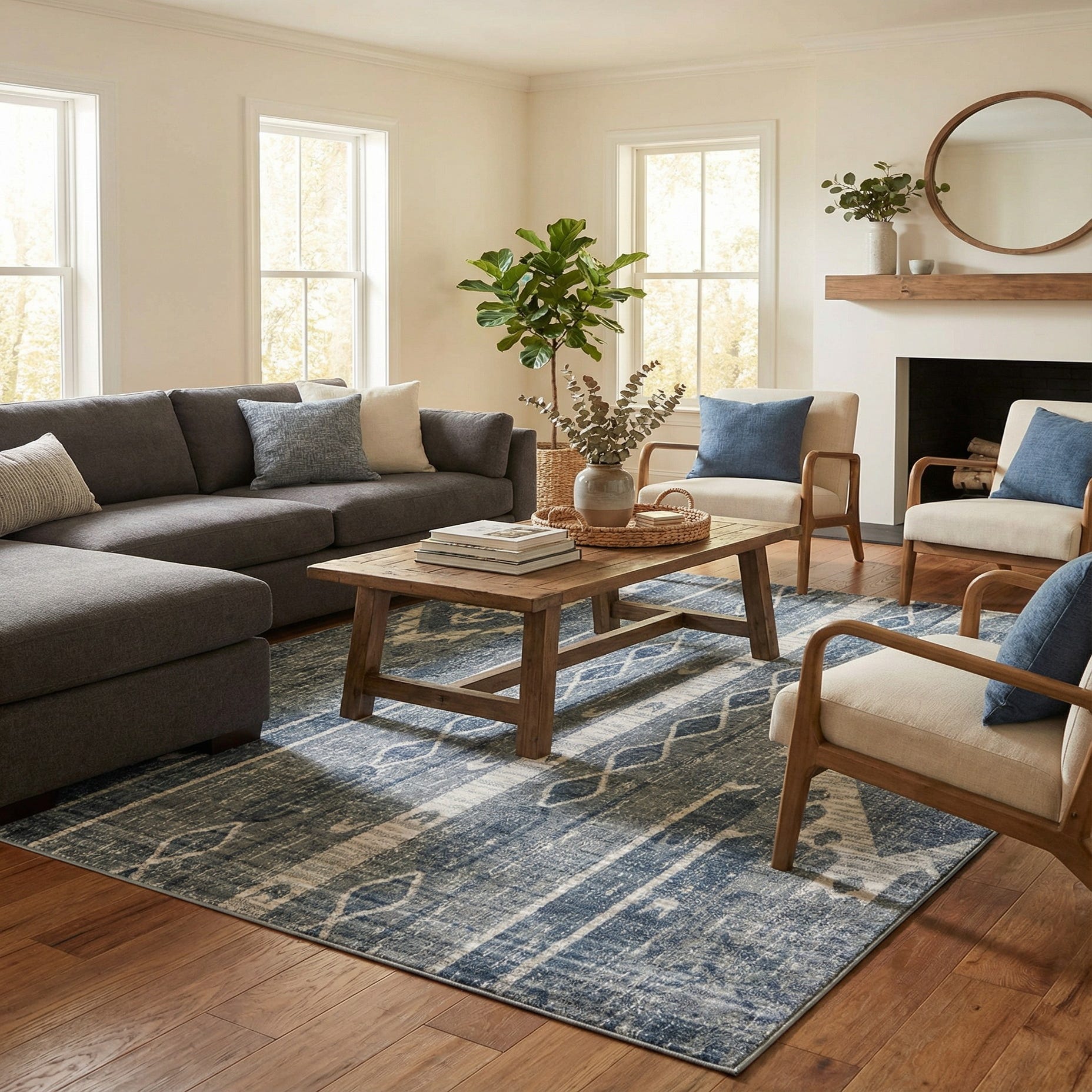 This rug works well as an anchor for a living room seating group, a grounding layer beneath a dining table, or a calming addition to a bedroom or home office. Pair it with warm wood furniture and neutral upholstery for a relaxed, modern farmhouse look, or combine with navy accents and matte metal finishes for a contemporary coastal or transitional scheme. Its muted palette and textured surface make it an easy backdrop for patterned pillows and layered textiles.