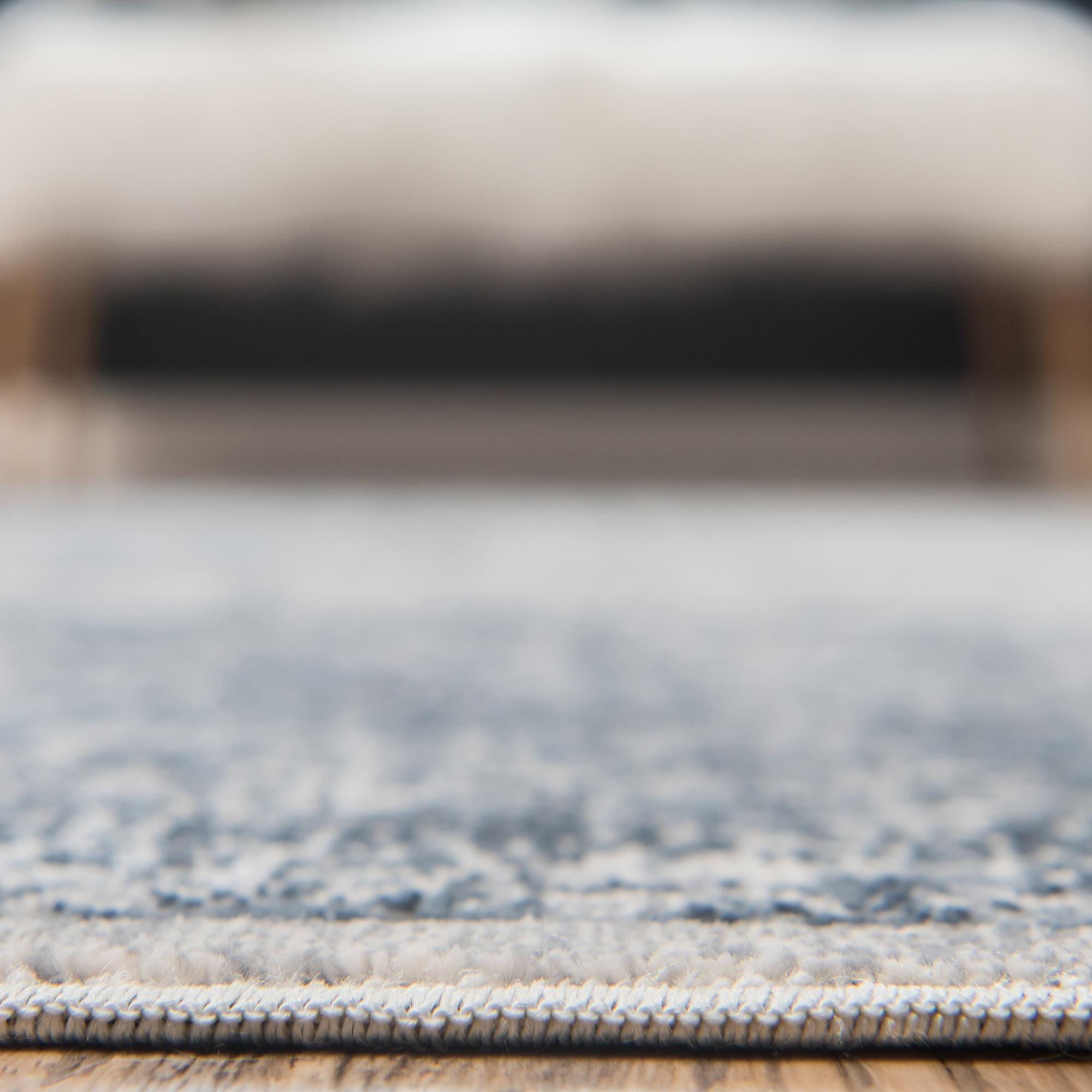 A distressed, vintage-inspired pattern gives this rug a layered, lived-in look: a soft blue-gray field punctuated with muted gray and beige motifs that form subtle medallion and border details. The finish reads slightly faded, with small, irregular areas of contrast that create visual depth without a sharply defined pattern. Machine made from 85% polypropylene and 15% chenille, the construction offers a low-profile pile with pockets of chenille loop and cut yarn that add a gentle, tactile softness and a faint, natural sheen.