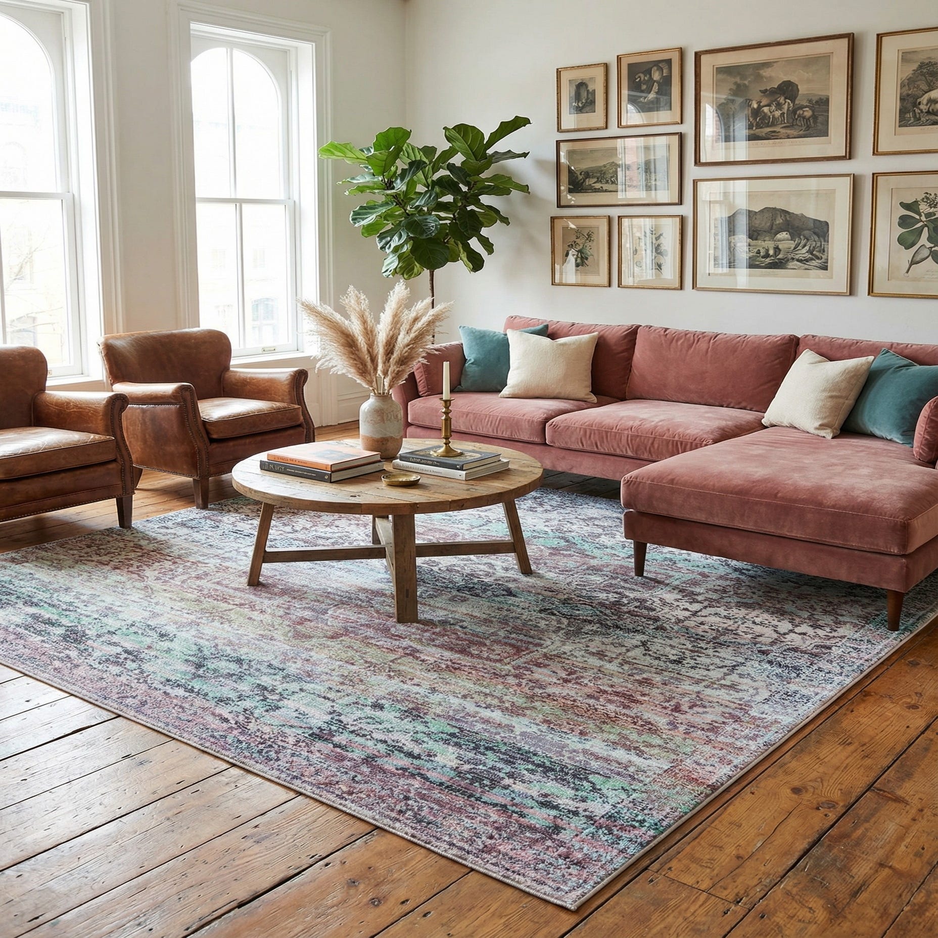 This rug pairs well with relaxed, layered interiors: place it beneath a neutral linen sofa to introduce color without overwhelming the room, anchor a dining area beneath a wood table for a modern coastal or transitional look, or soften a bedroom with mixed textiles and matte metal accents. Its muted palette and worn-in pattern work especially well with warm woods, slate grays, or black iron details for a balanced, inviting space.
