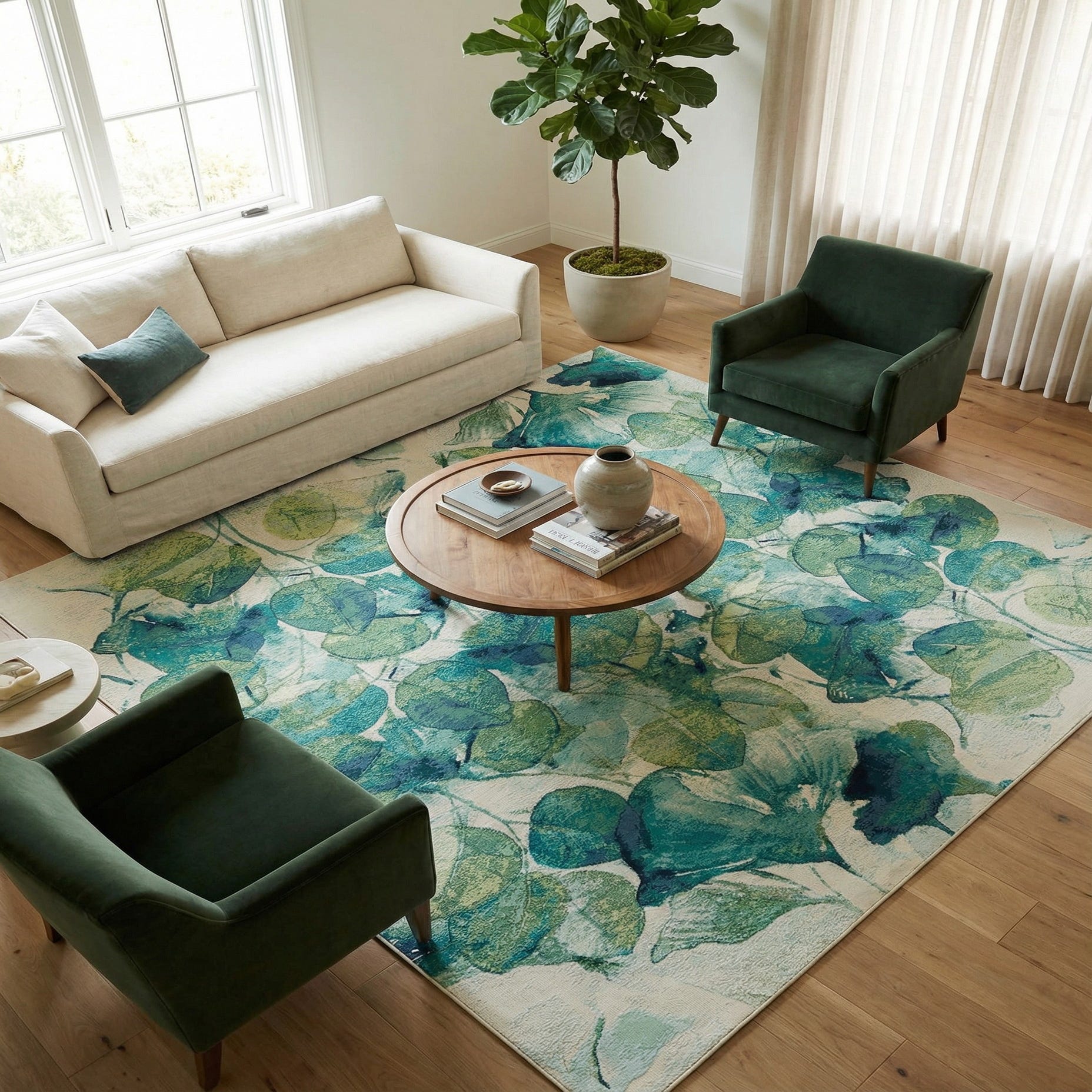 This rug works well with coastal, modern botanical, or transitional schemes. Place it beneath a light-wood dining table or anchor a seating area with a white linen sofa and navy pillows; it also complements rattan or wicker furnishings and woven accent pieces in a sunroom or covered patio. Pair with brass or matte-black metal accents for contrast or keep the palette airy with pale woods and natural fibers for a calm, layered look.
