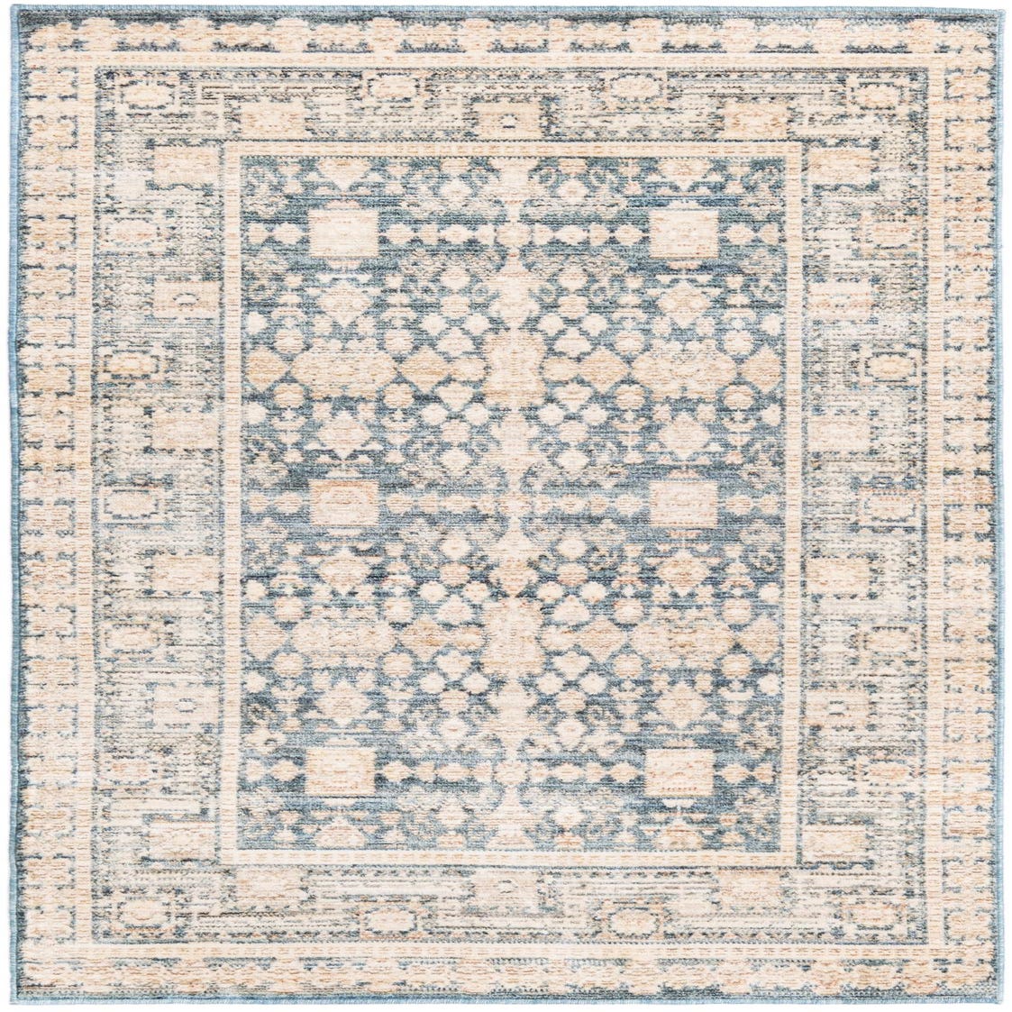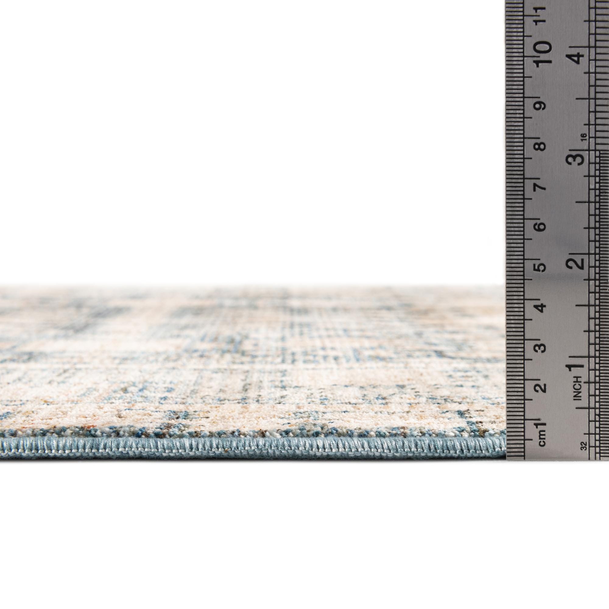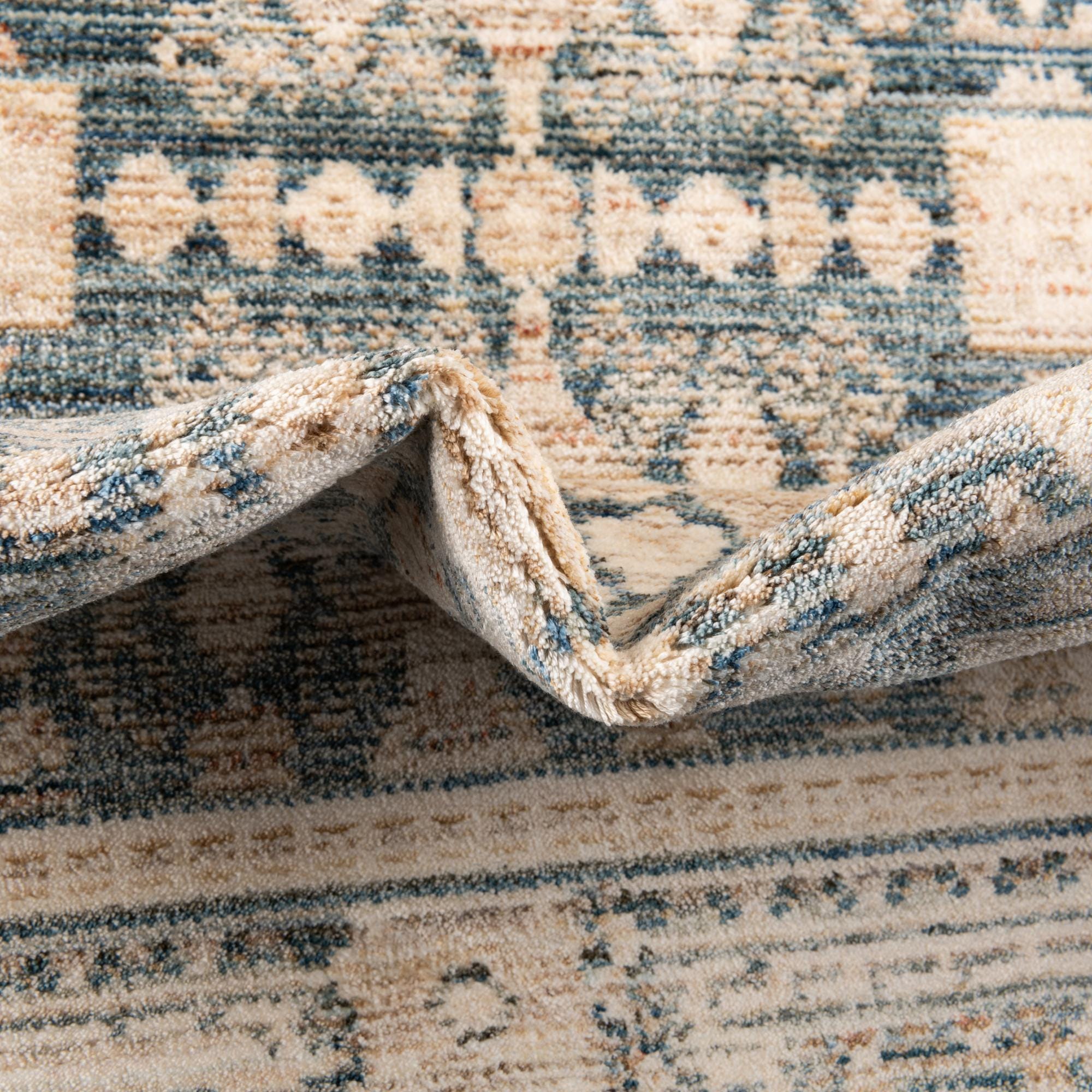 A 3x5 rectangular Noble collection rug featuring a distressed blue and cream geometric pattern with a subtle border.