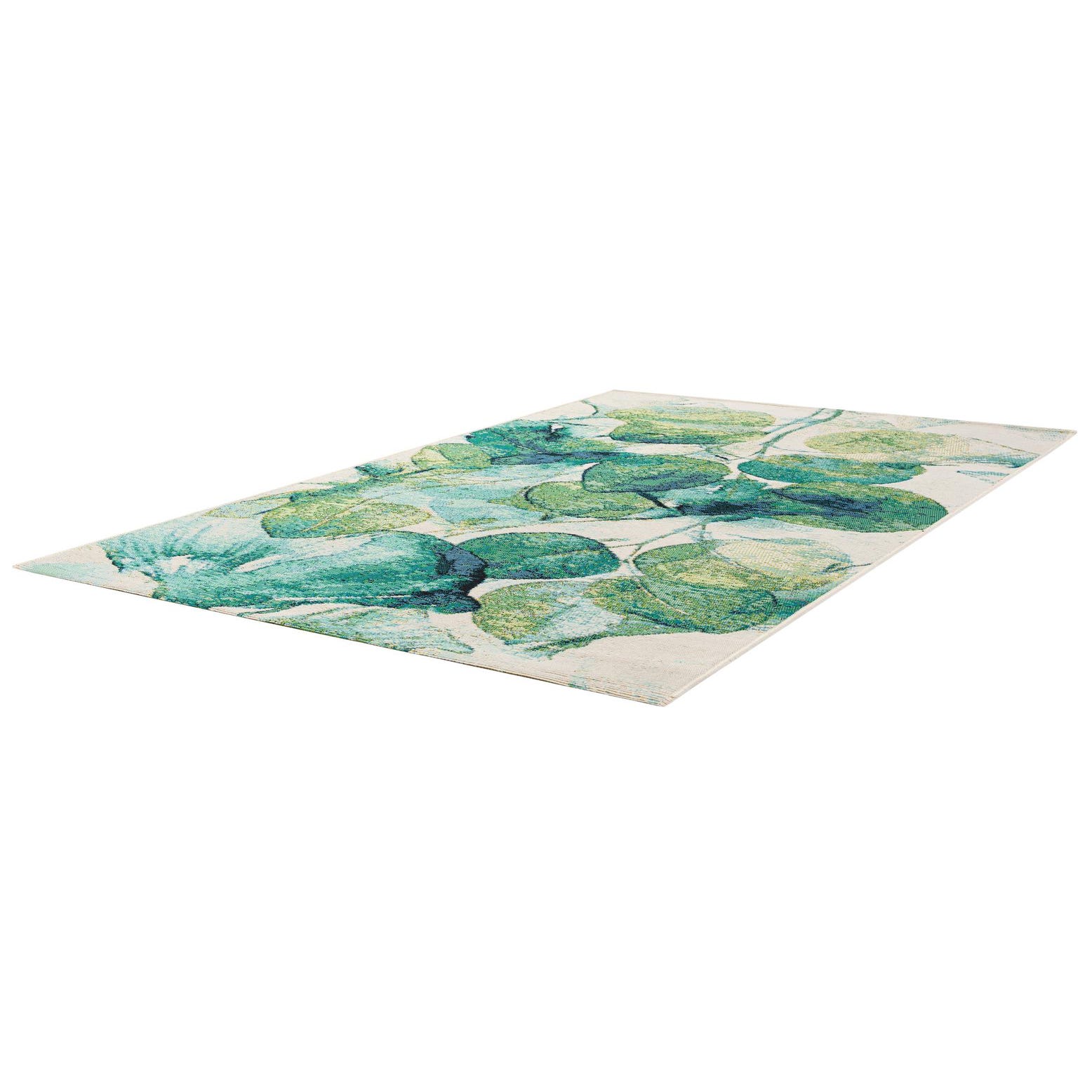 Oversized botanical leaves float across a blue-green ground in a painterly, layered composition that balances organic movement with a contemporary sensibility. Leaves in ivory, navy blue, yellow and touches of brown are rendered with varied opacity and subtle vein details, creating depth and a watercolor-like effect. Machine made from 75% polypropylene and 25% polyester, the rug has a low-profile, tightly woven surface with a slight ribbed texture that feels smooth underfoot while still offering a tactile, woven hand.