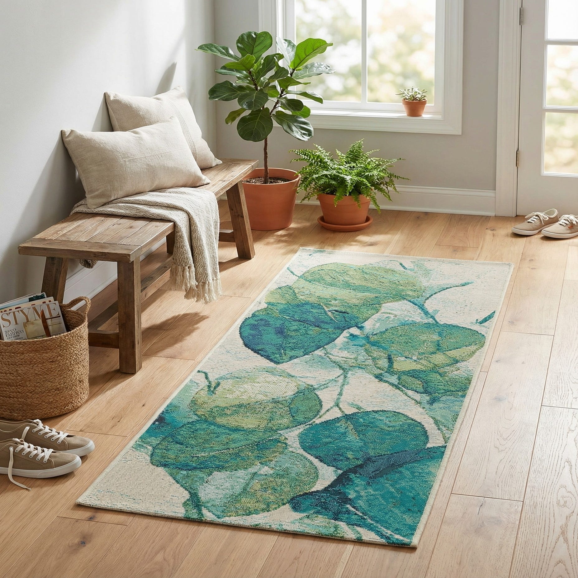 This runner works well in a sunlit hallway, covered porch, or narrow kitchen where a touch of botanical color can unify a space. Pair it with light wood furniture and crisp white trim for a coastal-inspired scheme, or combine it with navy accents and rattan pieces for a casual, modern eclectic look.