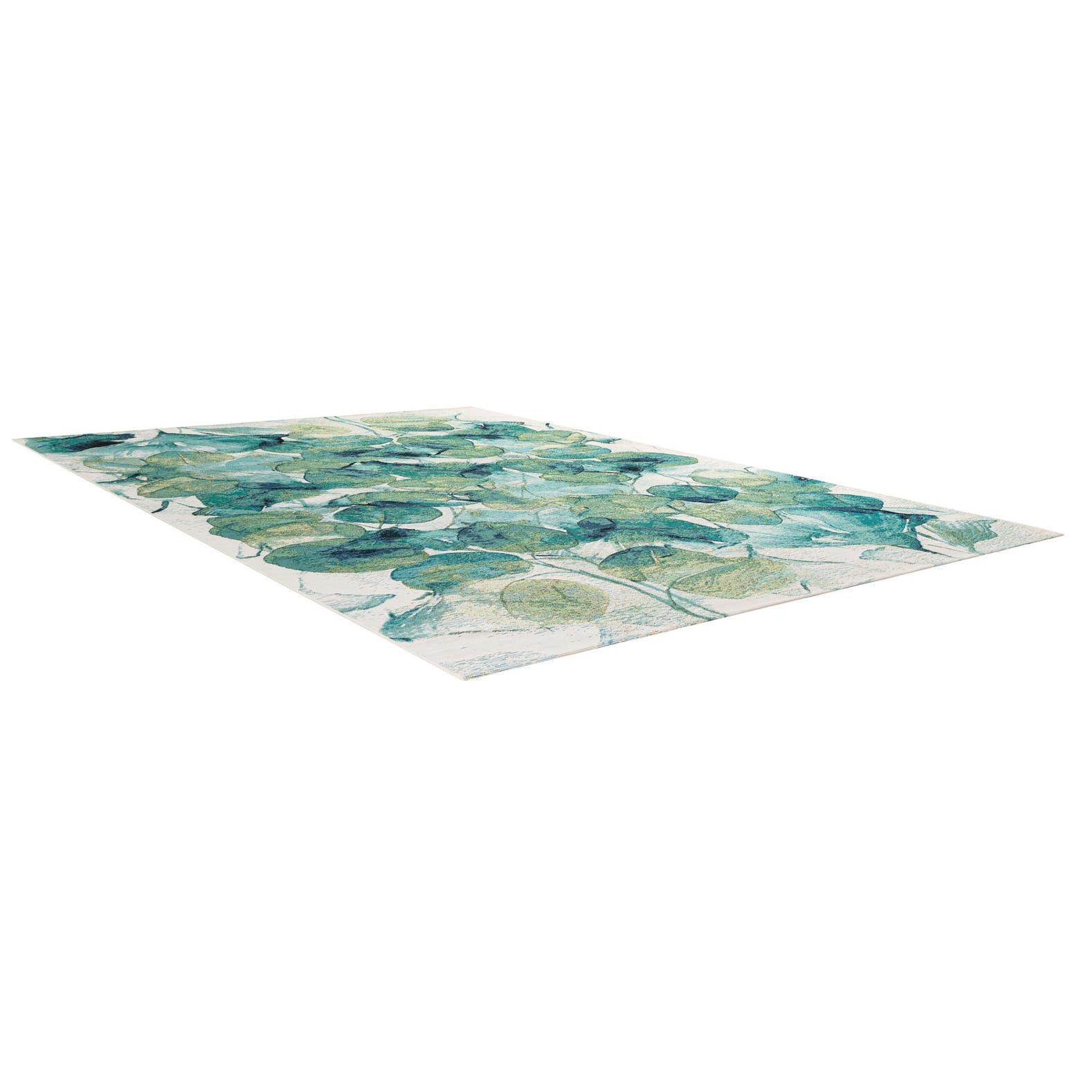 An 8x11 rectangular rug featuring a modern floral pattern of various blue and green leaves on a light background.