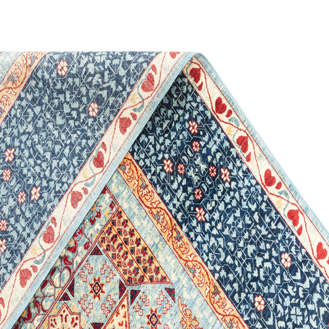 Primary color is Blue. Colors in this rug include: Blue, Rectangle.