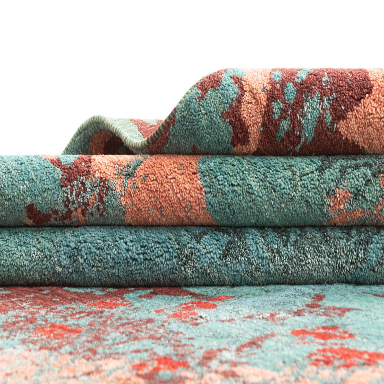 A rectangular handmade wool rug featuring an abstract Persian design with blues, peach, and deep red accents.