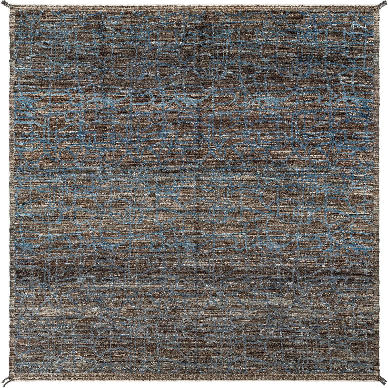 A rectangular Beni Marok wool rug featuring a distressed Persian pattern in shades of blue and brown.