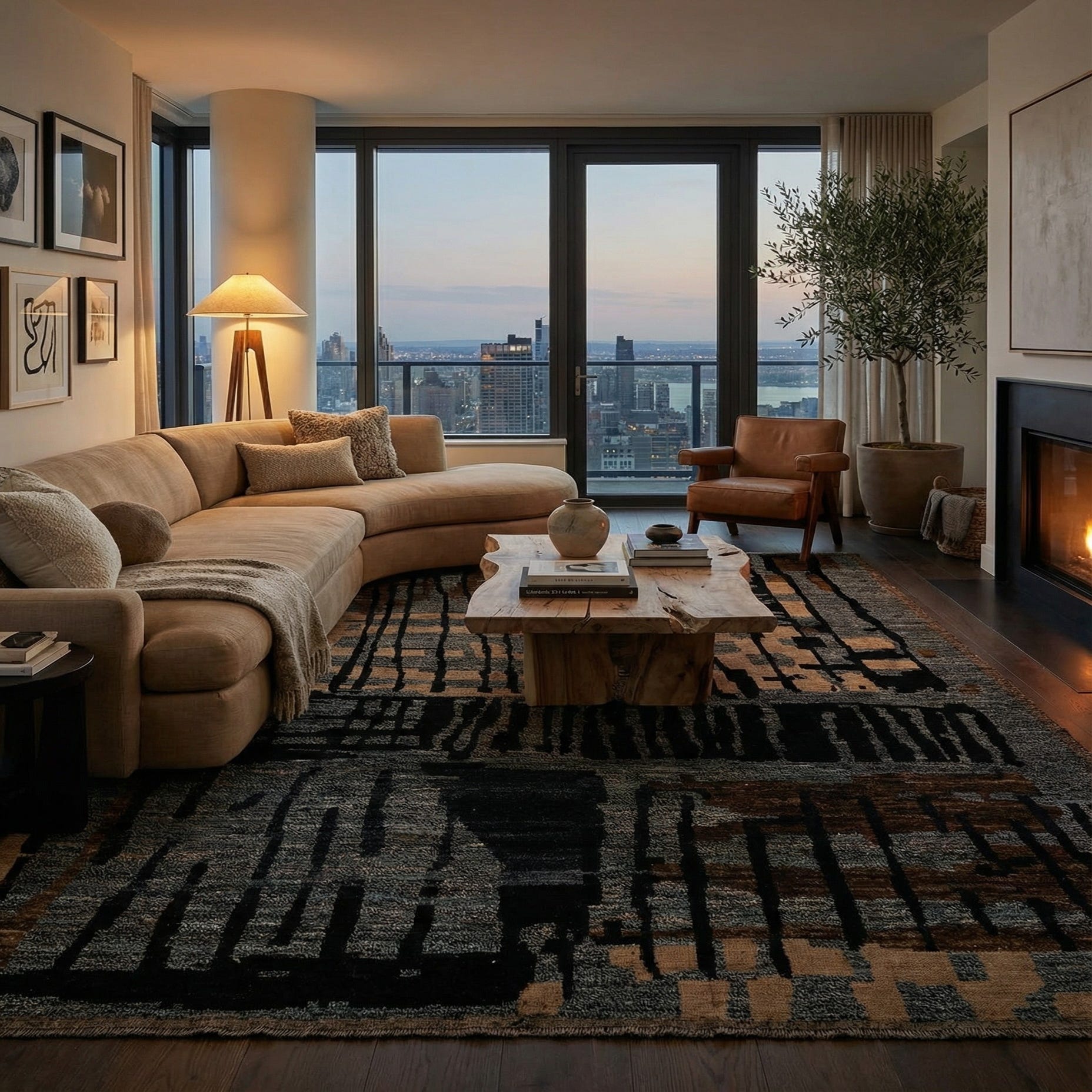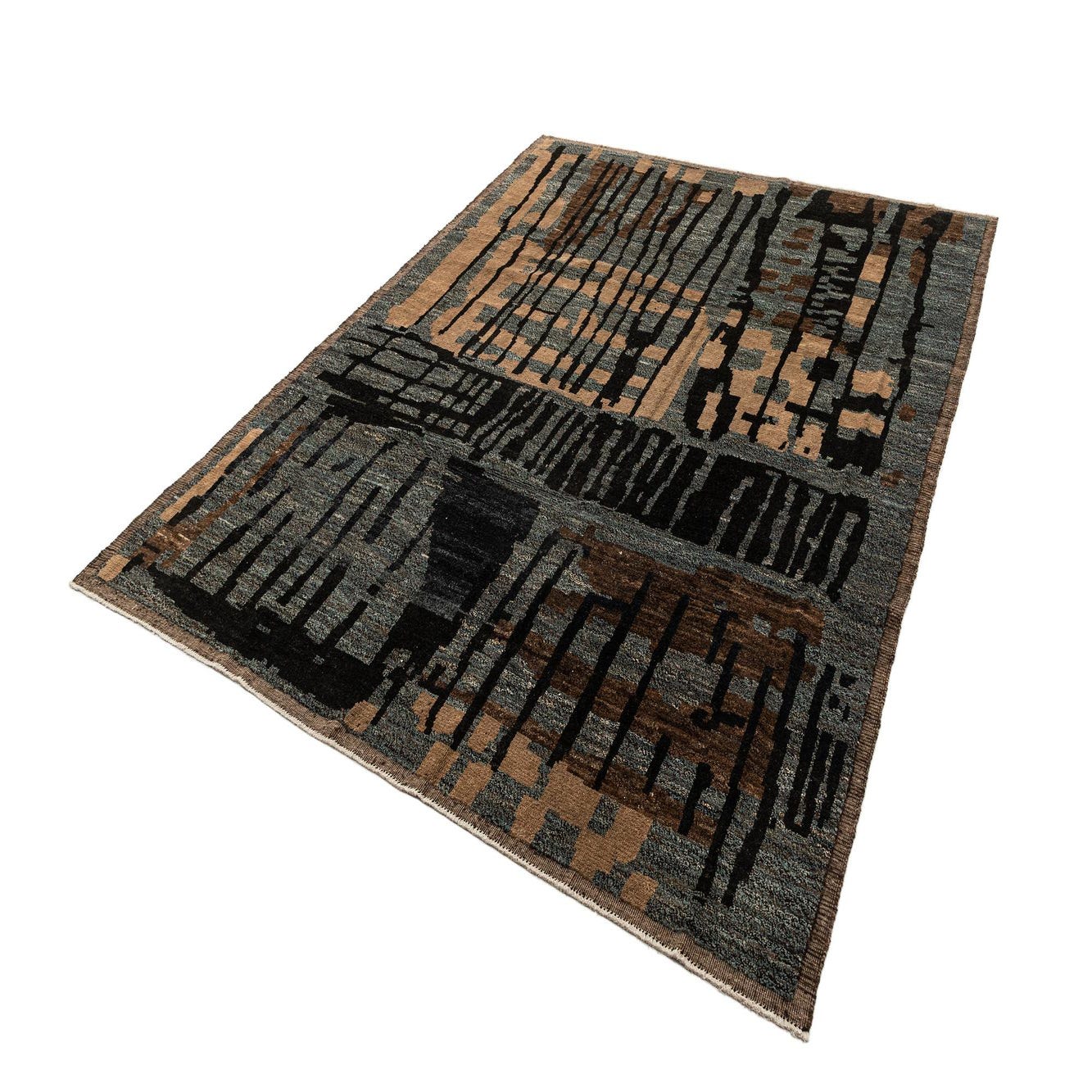 A rectangular Beni Marok wool rug featuring an abstract Persian pattern in shades of blue, black, and brown.