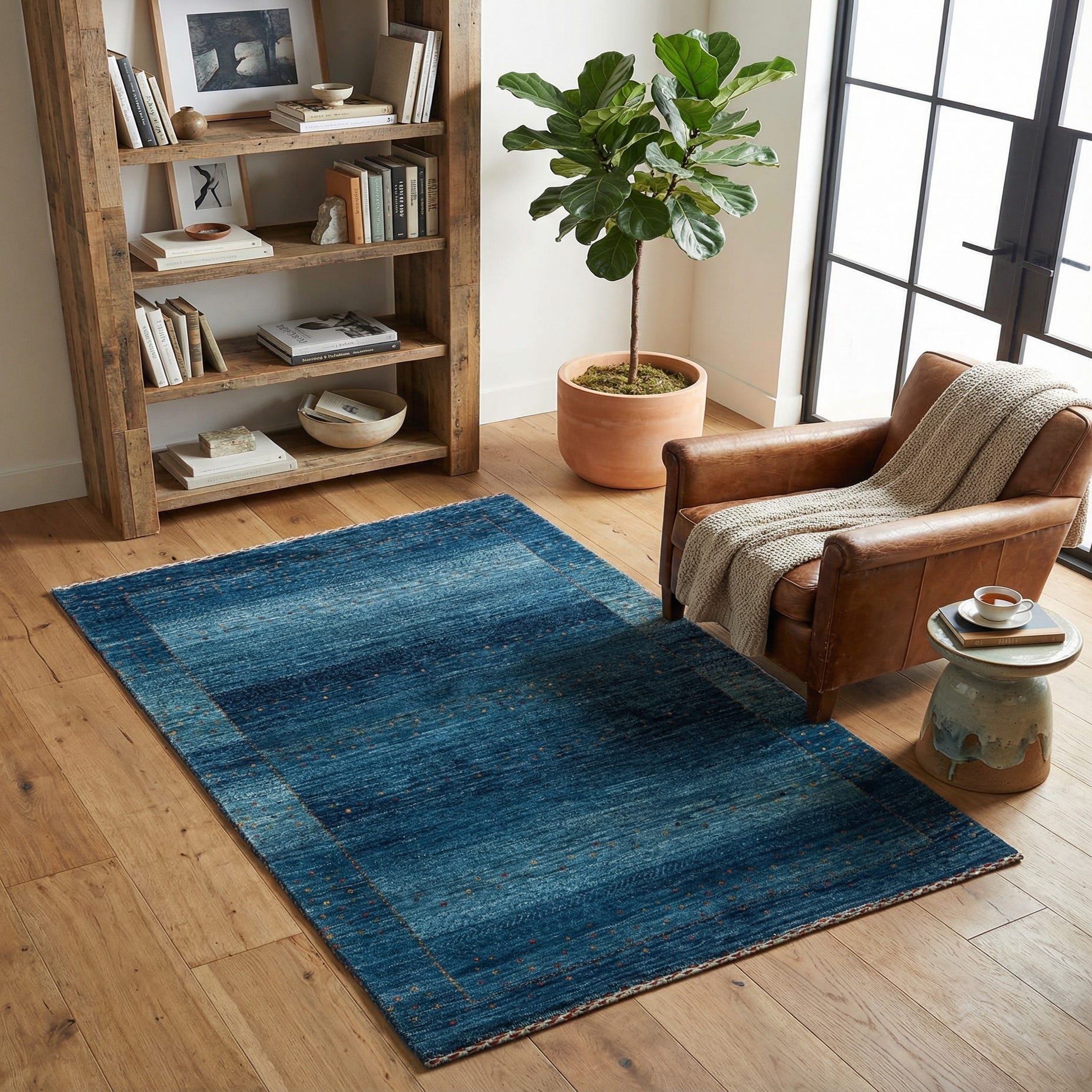 This rug works well as a grounding piece in a contemporary living room beneath a coffee table, layered in a relaxed bedroom to anchor the bed, or placed in a home office to add color without competing with furniture. It pairs particularly nicely with light woods and neutral upholstery for contrast, or with leather and brass accents for a warm, collected look. The simple pattern and strong blue tone also complement coastal, mid-century modern, and transitional interiors where a calm, structured base is desired.