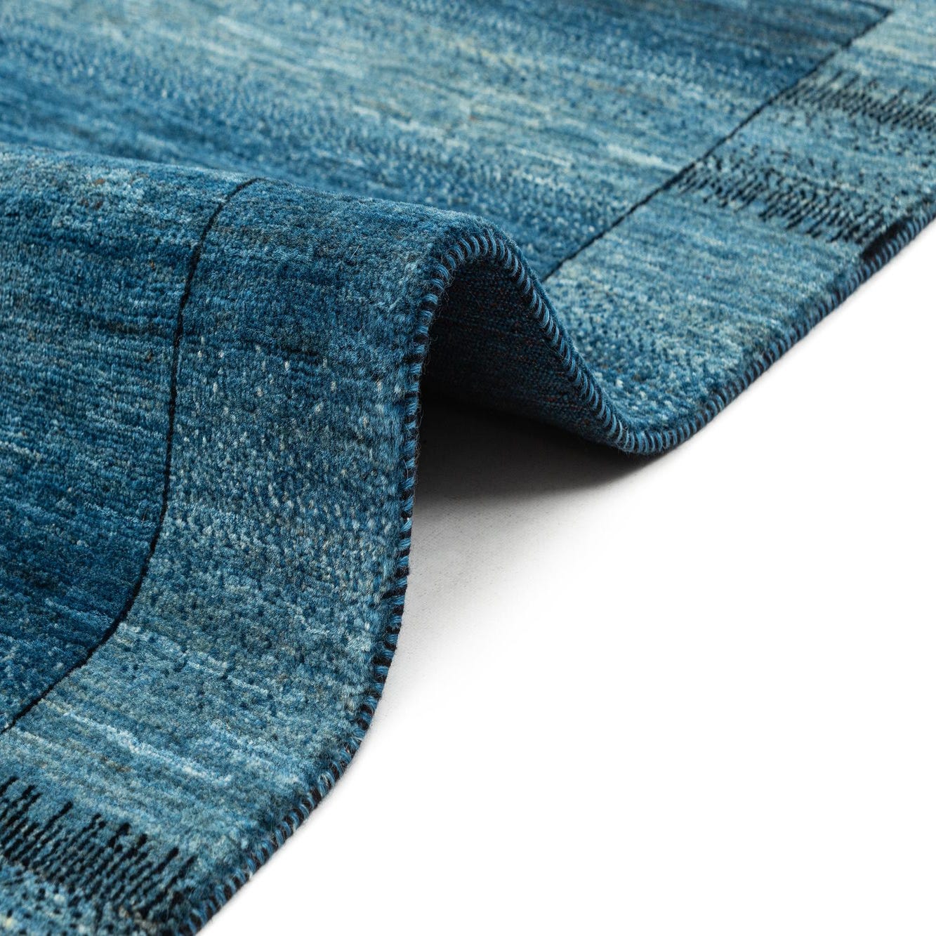 A rectangular Kashkuli Persian wool rug in varying shades of blue, featuring a solid dark blue center and lighter blue border with subtle textured patterns.