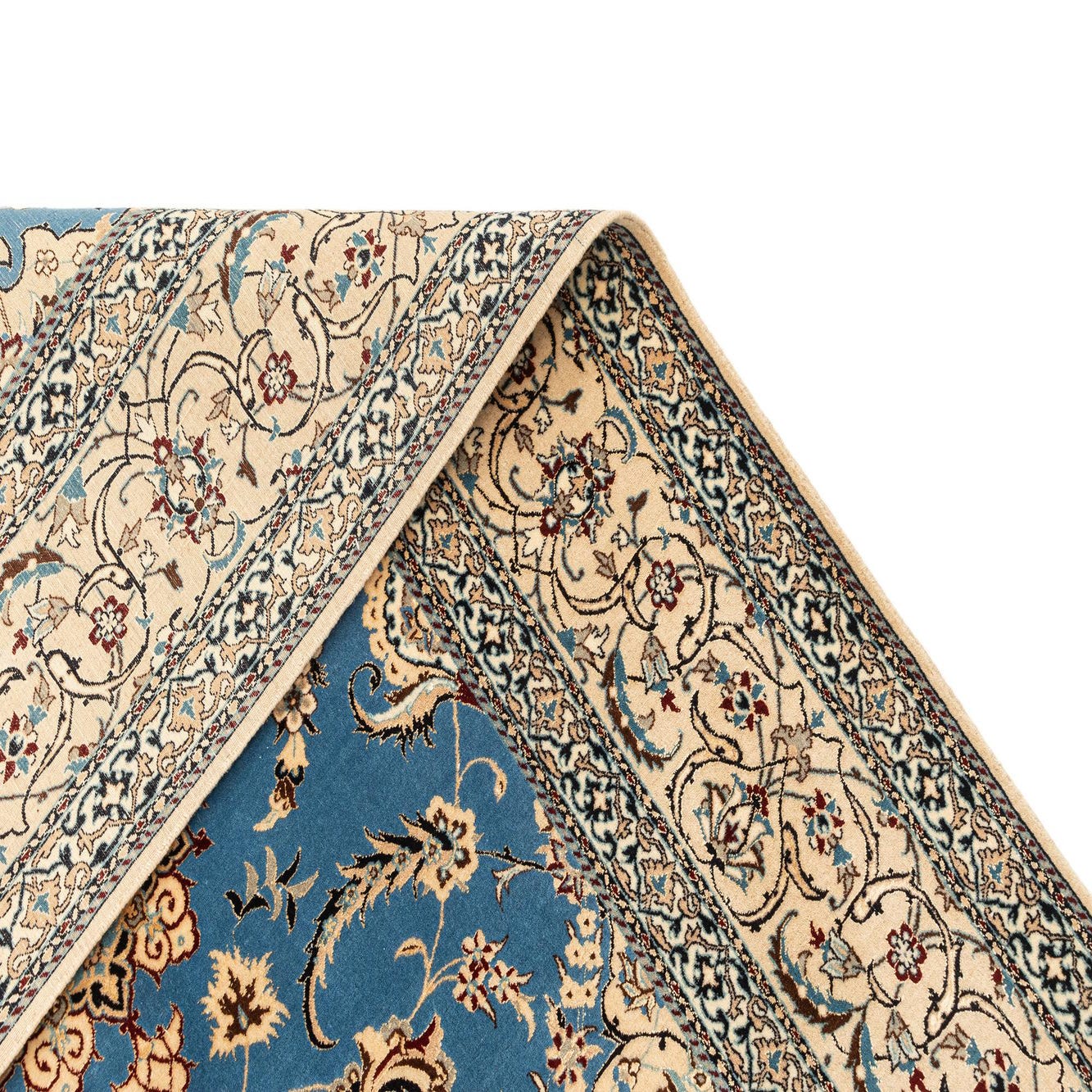 A handmade rectangular Persian rug featuring a rich blue field with intricate floral motifs and a detailed cream border.