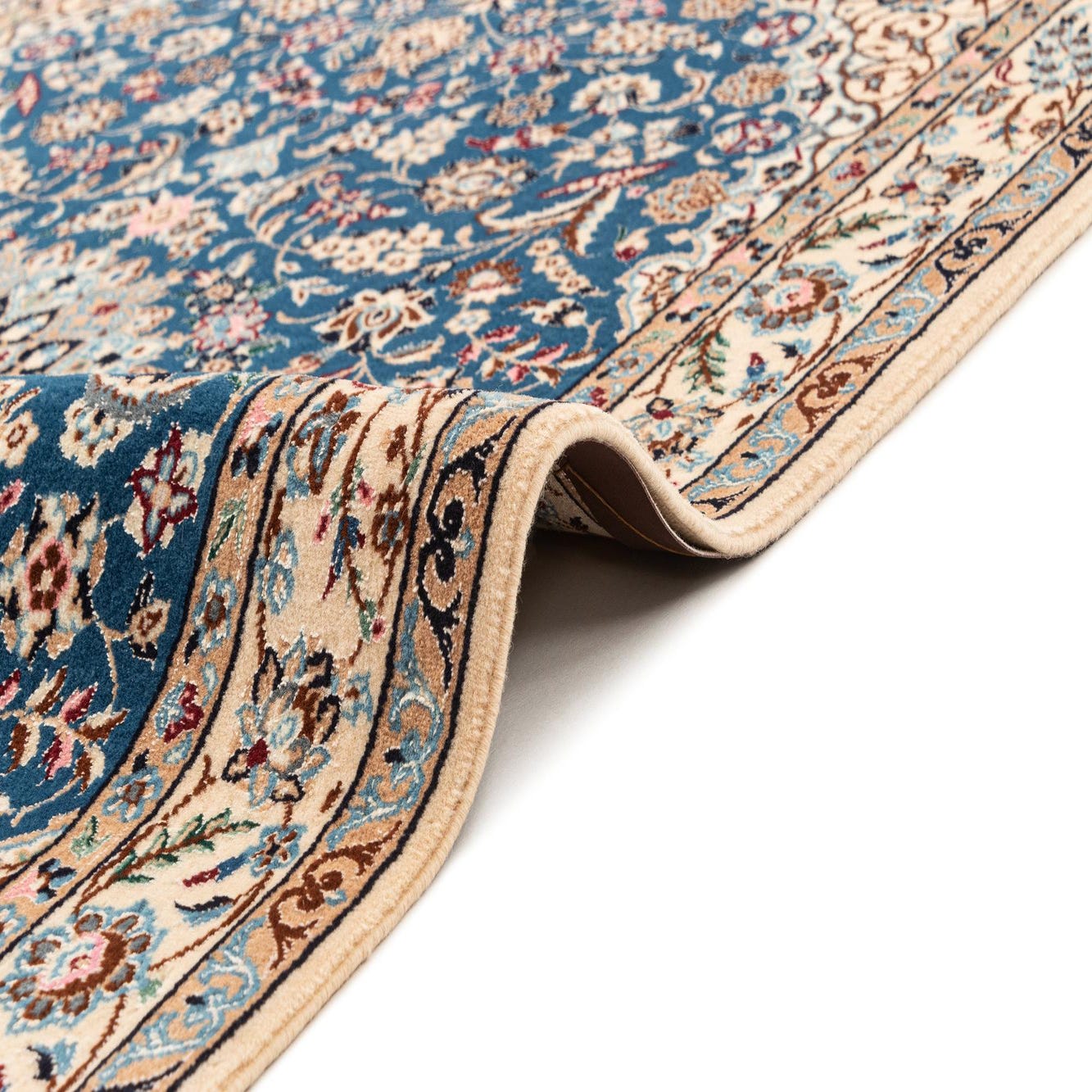 A rectangular handmade Persian rug with a deep blue field and intricate floral patterns, bordered by a cream frame.