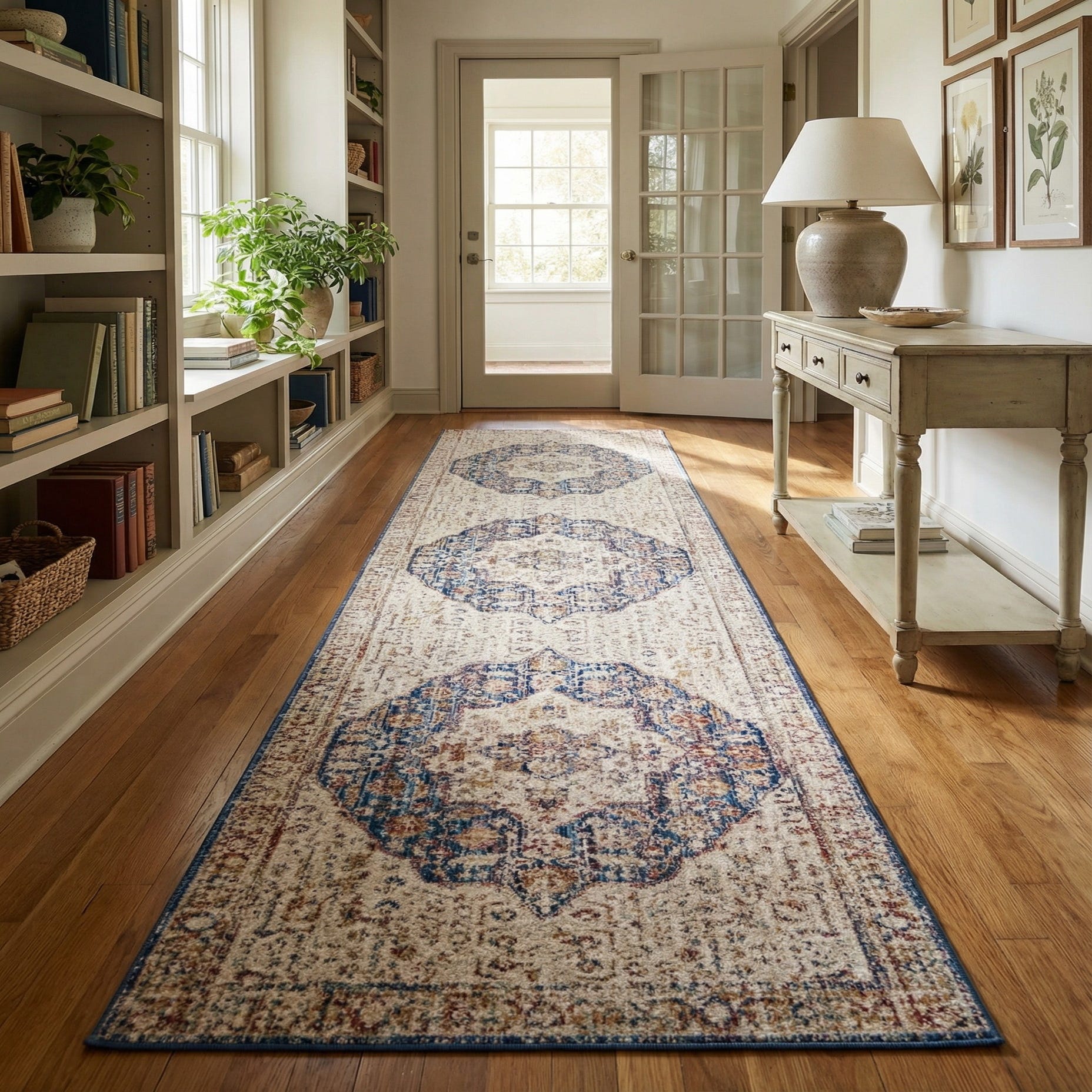 Designed for long, narrow areas, this runner works well in entryways, hallways, galley kitchens or alongside a bed to anchor a walkway. The blend of traditional medallion pattern with muted, coastal-ready blues and warm browns makes it easy to pair with transitional, cottage, or classic interiors—try it layered over neutral wood floors or beneath a slim console table to add pattern without overpowering the space.