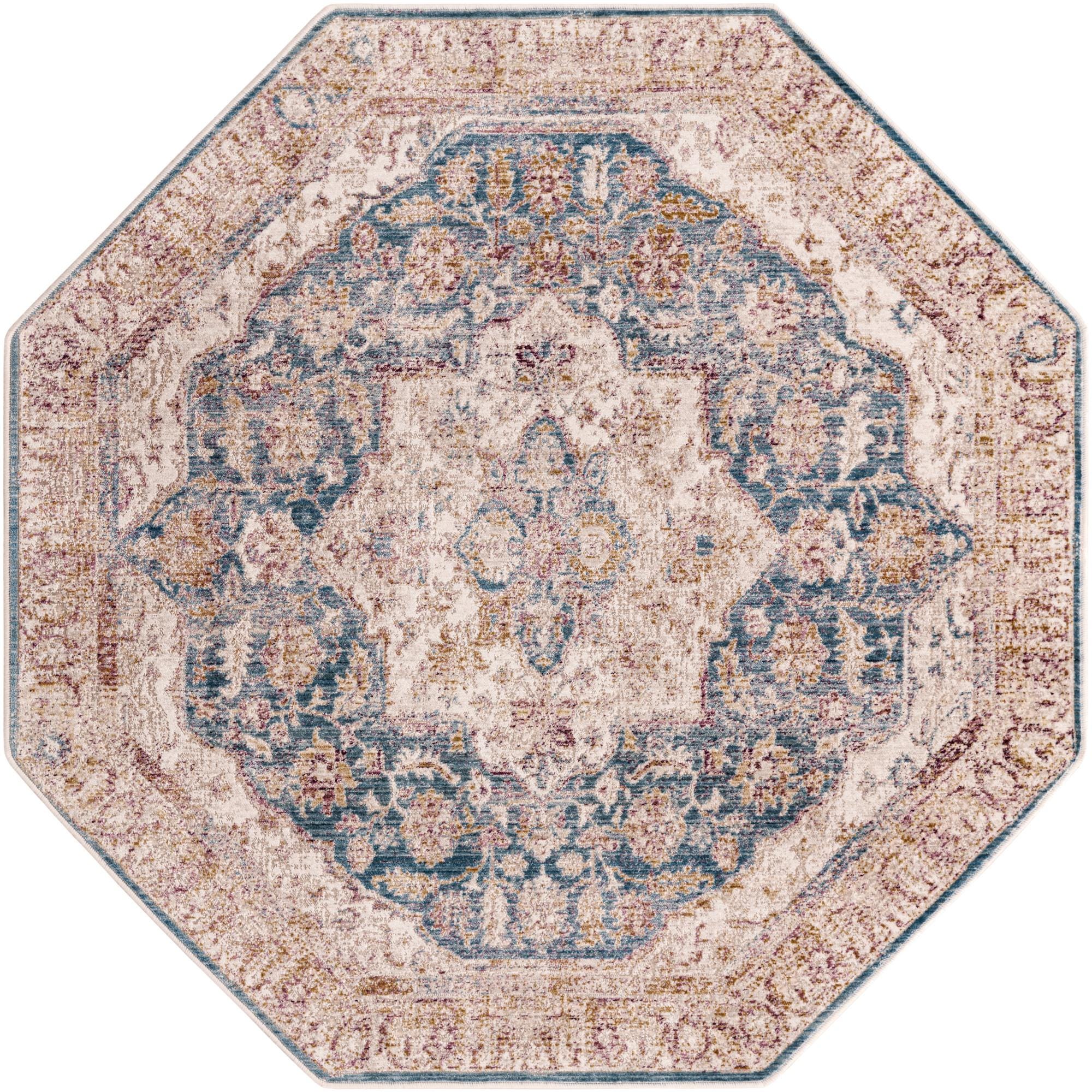 A soft, low-profile rug with a vintage-inspired medallion design, this octagon piece pairs a Blue Ivory background with layered accents of ivory, beige, burgundy, light blue and light brown. Floral motifs and scrolling details form a central medallion that radiates outward into a warm, distressed border. The pattern has a gently faded look that creates visual depth and a lived-in character, while the surface has a smooth, plush feel underfoot thanks to its machine-made 100% polyester construction.