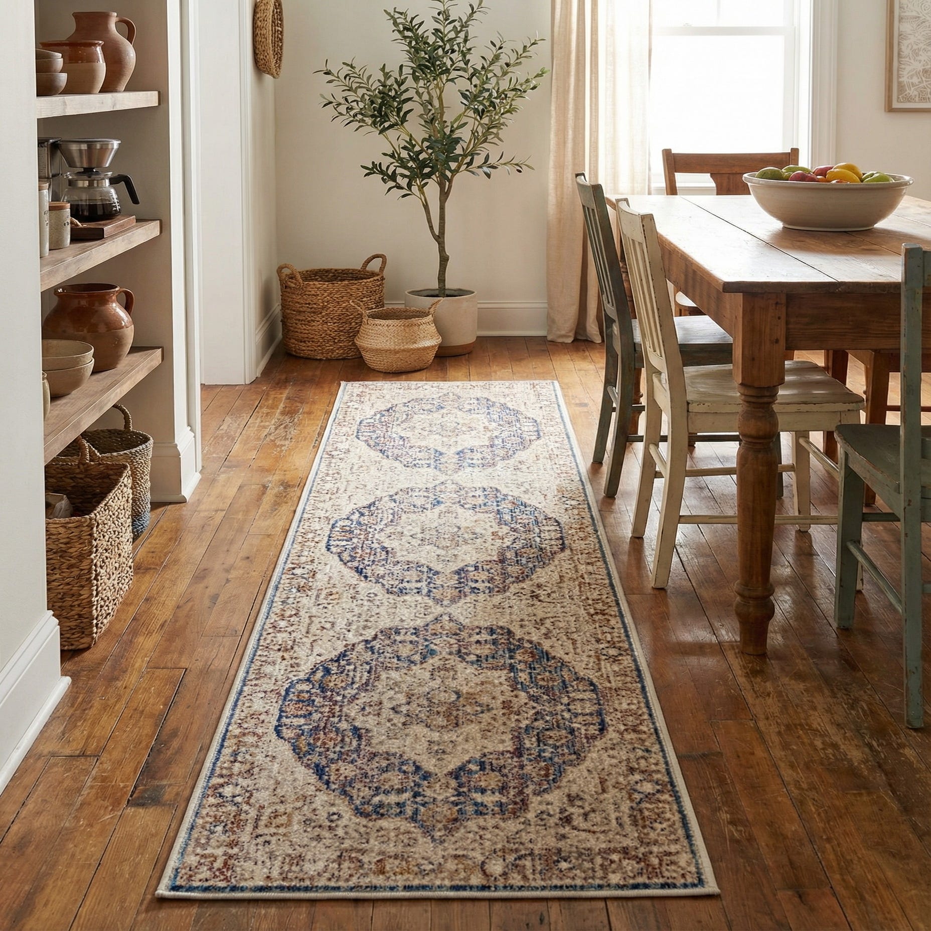 This runner works well in transitional and traditional interiors as a grounding element in a hallway, entryway, or alongside a kitchen island. It pairs nicely with warm wood floors, painted furniture in muted tones, or mixed-metal hardware; consider it for a cottage-inspired corridor, a modern farmhouse entry, or layered in a bedroom with neutral bedding to add pattern and color without overpowering the space.