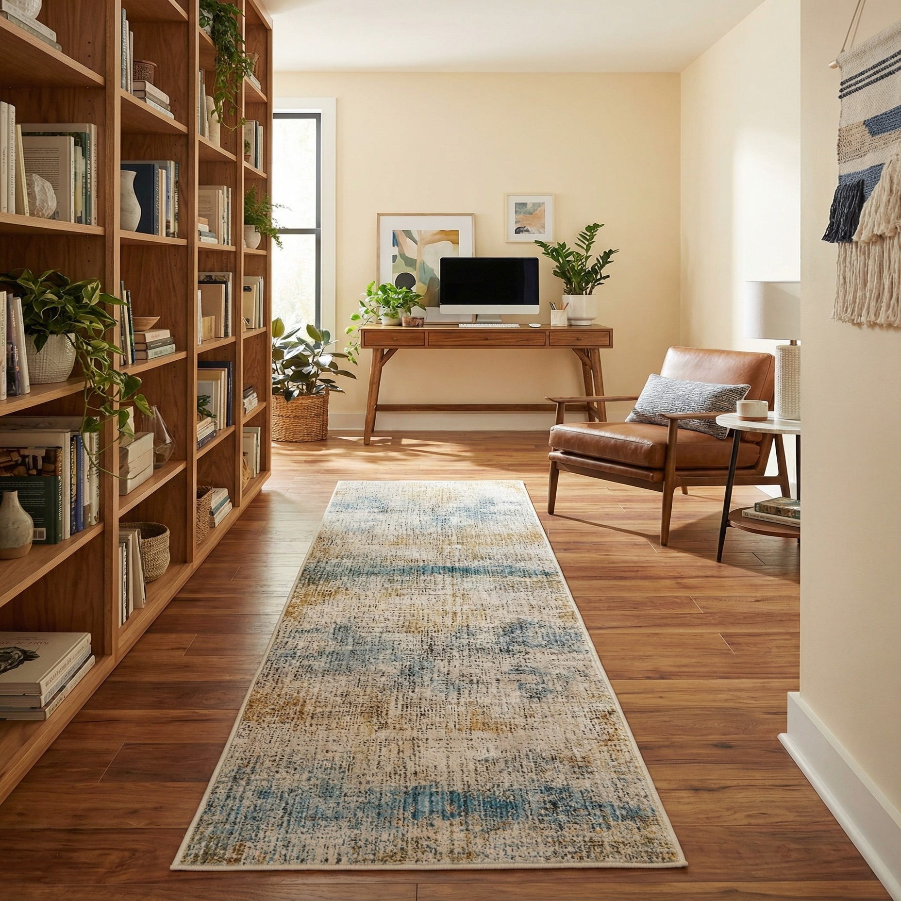 A Deepa 8 Ft runner rug with an abstract pattern in blues, ivories, and subtle gold tones, ideal for a hallway.
