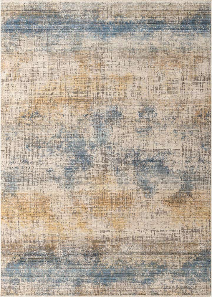 Primary color is Blue Ivory. Colors in this rug include: Blue Ivory, Gray, Ivory, Yellow, Navy Blue.