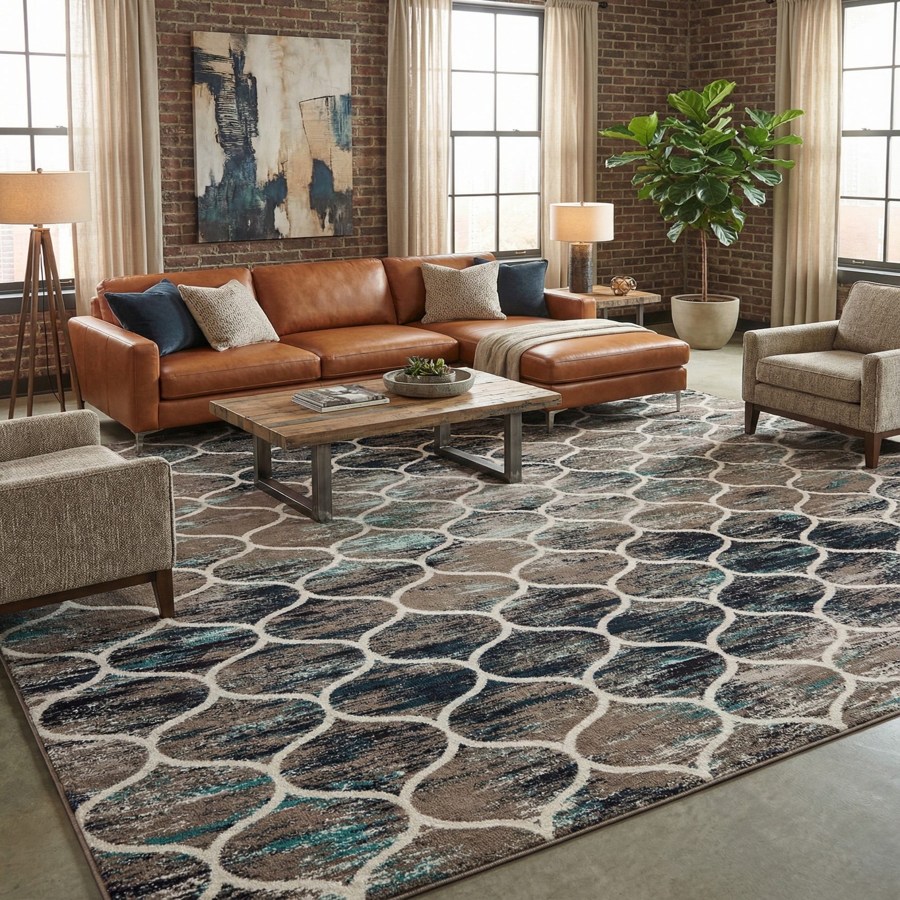 This rug adapts well to a variety of interiors: place it under a seating area with a neutral linen sofa and navy accents to bring out the blues, or use it beneath a glass-top coffee table to let the pattern become a focal point in a contemporary living room. It also pairs nicely with warm wood furniture and leather pieces for a transitional look, or with light, airy furnishings in a coastal-inspired space where the light-blue highlights can tie the palette together.