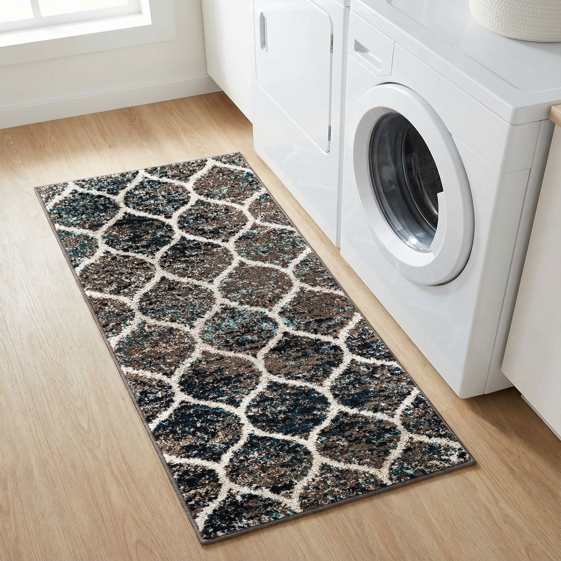 A 4 ft runner rug featuring a modern trellis pattern in shades of blue, brown, and cream, ideal for a hallway.