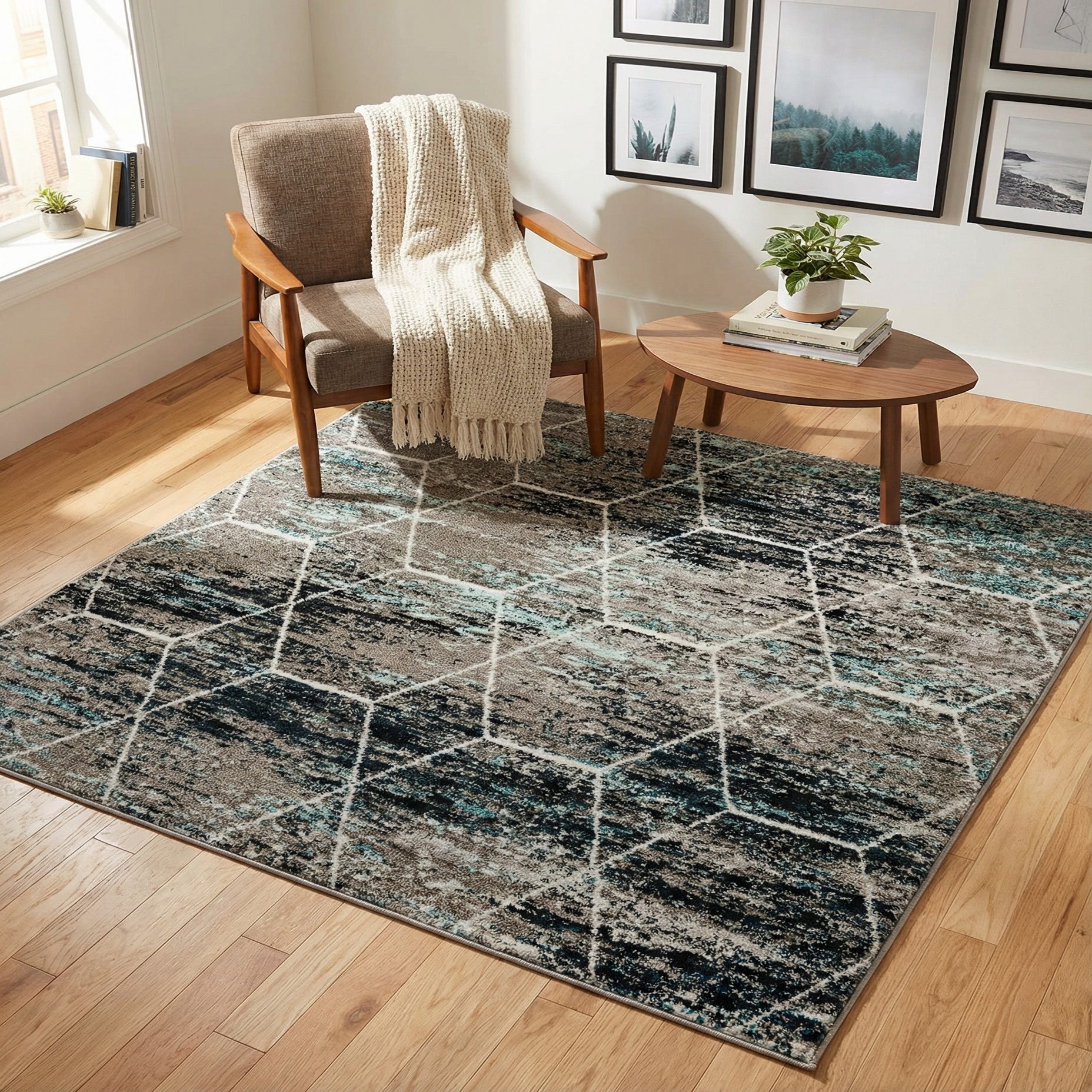 The modern-meets-relaxed pattern works well in a range of interiors. Place it to anchor a contemporary living room or beneath a casual dining set, where the blue and turquoise accents will coordinate with navy or teal upholstery and natural wood tones. It also complements transitional or coastal schemes, and functions nicely in a home office or bedroom to add pattern without overwhelming other elements.