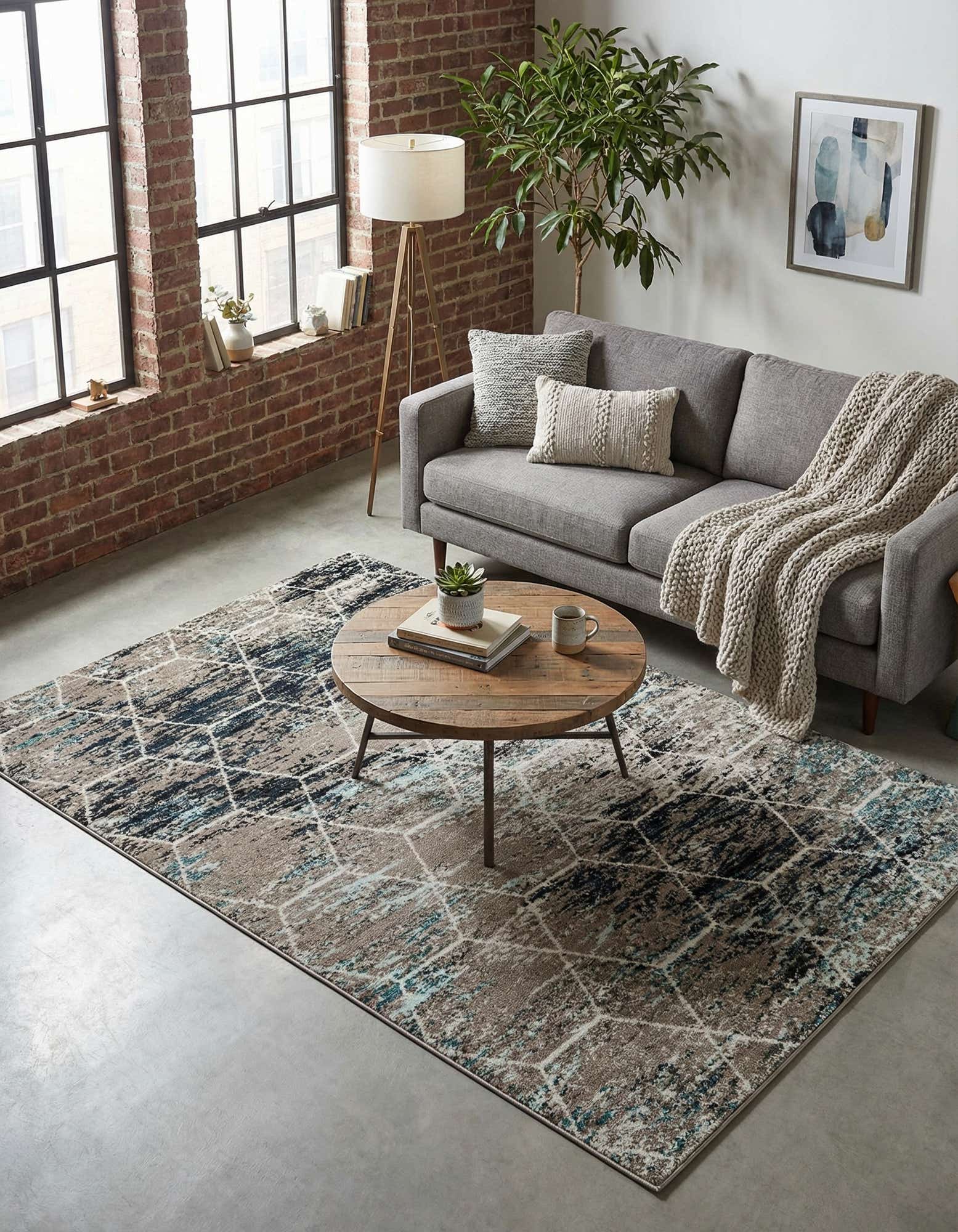 This rug fits well in contemporary, coastal, or transitional settings — pair it with a neutral sofa and navy throw pillows for a cohesive living room, tuck it under a bed to add color and pattern to a bedroom, or use it to bring interest to a home office with light wood furniture. The cool blues and warm light-brown accents make it easy to combine with both warm neutrals and cool-toned decor.