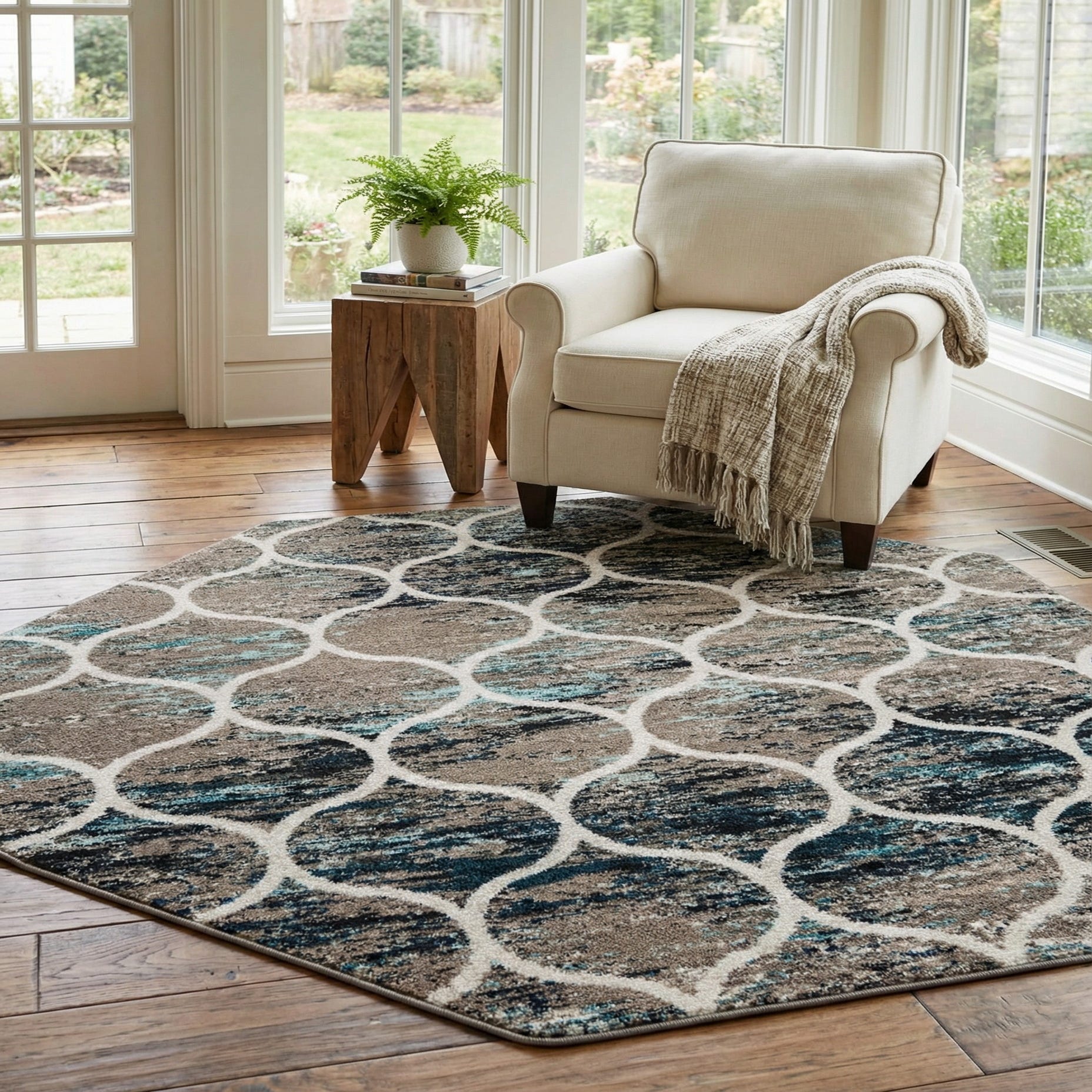 The octagon shape makes this piece a strong choice for defining smaller, focused areas — think a cozy conversation nook, an entryway that needs visual interest, or centered beneath a round dining table. It pairs well with warm wood tones and neutral upholstery, and will also complement navy or teal accents and metallic finishes for added depth. The rug’s pattern and colorway work with contemporary, transitional, and coastal-inspired interiors where a touch of pattern and layered color is desired.